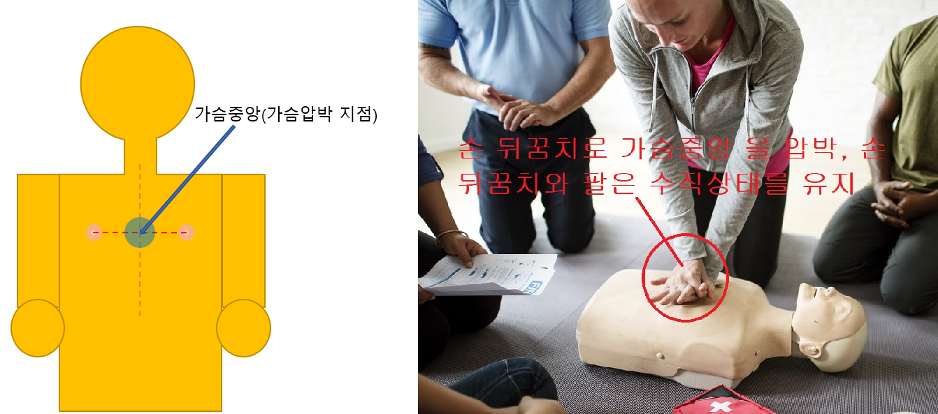 - 가슴압박: 환자의 가슴 중앙에 손을 핀 상태로 올려놓고 그 위에 다른손을 깍지껴서 포개어 놓습니다. 그리고 가슴중앙에 닿고 있는 손바닥 뒤꿈치를 이용하여(처음에 가슴중앙에 올려놓은 손바닥의 뒤꿈치) 가슴압박을 실시합니다.(이때, 가슴중앙에 닿고있는 손 뒤꿈치와 팔이 수직 상태를 유지해야 합니다. 즉, 가슴압박을 실시하는 팔을 계속 핀 상태를 유지하면서 가슴압박을 실시합니다.) 참고로 손 뒤꿈치로 압박을 실시하는 이유는 압박하는 힘이 제대로 심장에 전달되기 위해서입니다. 가슴압박은 분당 100~120회 속도, 5cm 정도 가슴이 내려갈 정도로 강하고 빠르게 실시해야 합니다. 가슴압박을 30회 실시하고 나면 인공호흡을 실시해야 합니다.