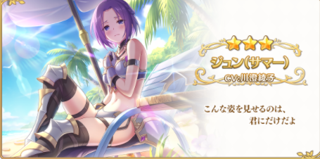 8월 15일에 공개되는 캐릭터는 쥰(여름) 캐릭터로, 기준 쥰 캐릭터의 여름버전 캐릭터입니다. 한정 캐릭터로 공개될 것으로 예상했으나 8월 14일 확인결과 통상으로 나오는것으로 확인되었습니다. 그리고 쥰(여름) 캐릭터의 포지션은 전열이며, 공격 계열을 담당하는 캐릭터입니다.