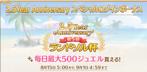 ● 2.5주년 기념 가챠(뽑기): 2020년 8월 15일 오후 3시 ~ 8월 26일 오전 11시 59분까지 개최되는 기념 가챠로, 기존 가챠보다 3성(가챠로 나오는 최대 레어도)이 나올 확률이 2배인 가챠입니다. 이 기간 동안에는 픽업 대상의 캐릭터가 출현할 확률이 2배가 되기때문에 다른 픽업 가챠보다 픽업 캐릭터를 획득하기 쉽습니다.(확률이 2배가되어 1.5%가 됐을뿐이라 해당 캐릭터가 나오지 않을 가능성이 상당히 높은건 여전합니다.) 이때까지의 경험상, 이 기간동안 쥰(여름) 캐릭터가 픽업이 되어있을 가능성이 높습니다.