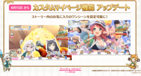 드디어 8월 15일부터 커스텀 마이페이지 기능이 추가됩니다. 기존에는 BD특전 코드를 등록하지 않은 이상 마이페이지에 캐릭터밖에 등록할 수 없었는데 8월 15일부터 이벤트 또는 스토리에서 나왔던 화면을 마이페이지에 등록하여 사용할 수 있게 되었습니다. 마음에 들었던 화면을 마이페이지에 등록하여 자신만의 프린세스 커넥트 리다이브를 만들어 보시길 바랍니다.