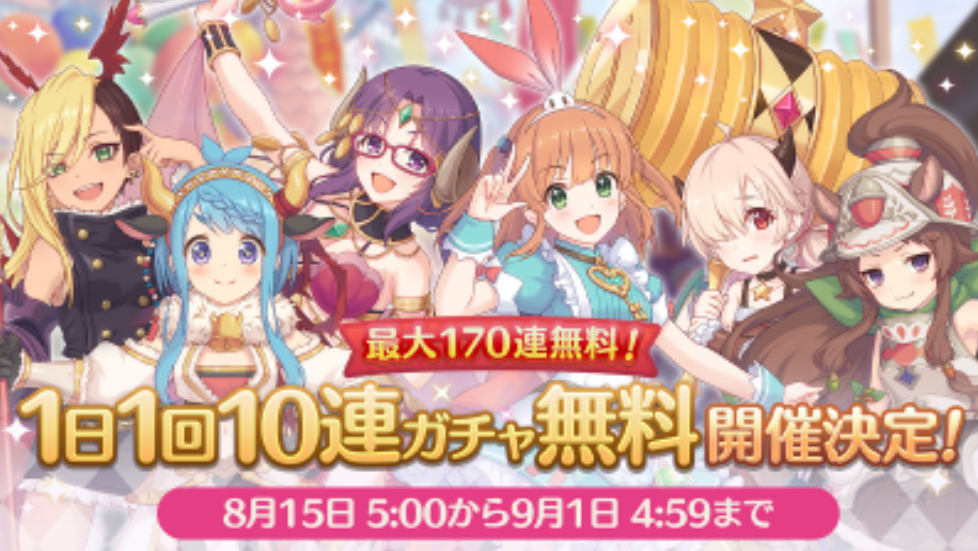 ● 무료 10연 가챠(뽑기): 2020년 8월 15일 오전 5시 ~ 2020년 9월 1일 오전 4시 59분까지 매일 무료 10연 가챠 기회를 줍니다. 8월 15일부터 17일간 실시되기 때문에 최대 170연 가챠(뽑기)가 가능합니다. 무료 10연 가챠가 실시되는 시간을 잘 체크하셔서 가챠 계획을 세우시길 바랍니다.