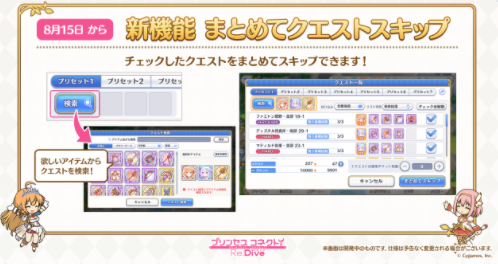 예전부터 업데이트를 한다고 했던 모아서 퀘스트 스킵 기능이 8월 15일부터 추가됩니다. 프리셋으로 원하는 아이템 또는 메모리 피스를 설정하여 한번에 스킵하여 스태미나와 스킵 티켓을 소모하는 기능입니다. 기존의 스킵 기능보다 더 빠르고 편하게 스태미나를 소모할 수 있게 되었습니다.