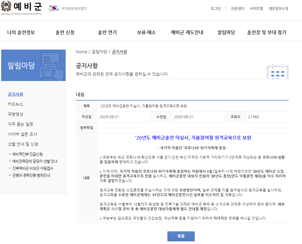 공지사항에 따르면, 국방부는 현재 코로나로 인하여 사회적 거리두기가 2단계로 격상되어 있는 것을 인식하고 있으며 이에 따라 9월 1일부터 실시할 예비군 훈련을 비대면 원격교육으로 전환 실시하며, 예비군 훈련 대상자 전원의 2020년 훈련을 이수 처리하겠다고 알려주고 있습니다. 그리고 원격교육을 수료한 예비군들에게는 2021년 예비군 훈련시간의 일부를 이수 처리해줄 계획을 밝히고 있으니 되도록 원격교육을 수료하시길 바랍니다.