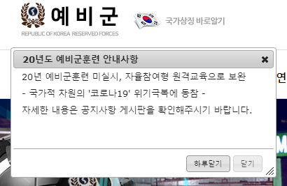 2020년 예비군 홈페이지 주소: https://www.yebigun1.mil.kr/dmobis/index_main.do