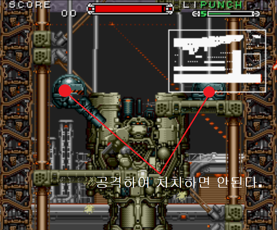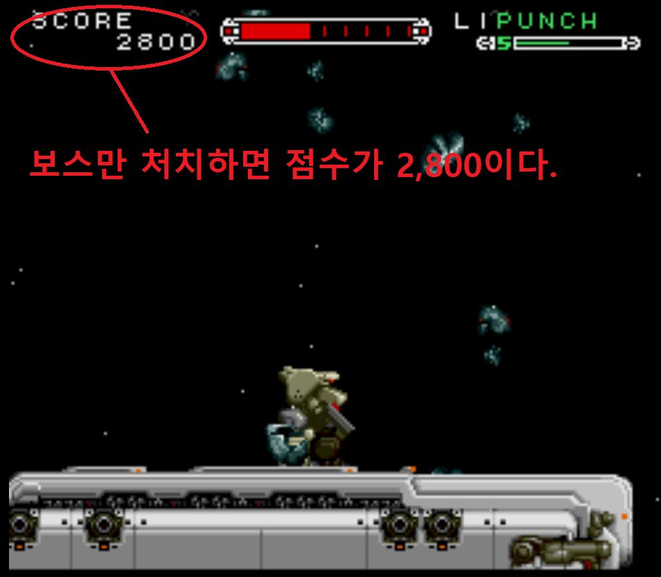 아무런 오브젝트를 파괴하지 않고 보스까지 오면 위와같이 보스전이 시작됩니다. 보스전에 대포의 모양을 하고 있는 적 2마리가 보스 주위에 출현하는데 이 적도 파괴하지 않아야 합니다. 대포의 모양을 하고 있는 적은 내구도가 상당히 약하기 때문에 자칫하면 처치해버릴 수 있기 때문에 조심하면서 오로지 보스만 처치해야 합니다. 스테이지 1에서 파워 아이템을 하나도 얻지 않고 온 상황이기 때문에 소유하고 있는 무기의 레벨이 1입니다. 그렇기 때문에 화력이 상당히 약한 상태이기 때문에 보스전을 시작하면 거의 모든 시간을 보스를 공격하는 데에 사용해야 합니다. 일정 시간이 지나면 게임오버가 되기 때문에 빠르게 보스를 파괴해야 합니다. 개인적으로 추천하는 무기는 펀치입니다.