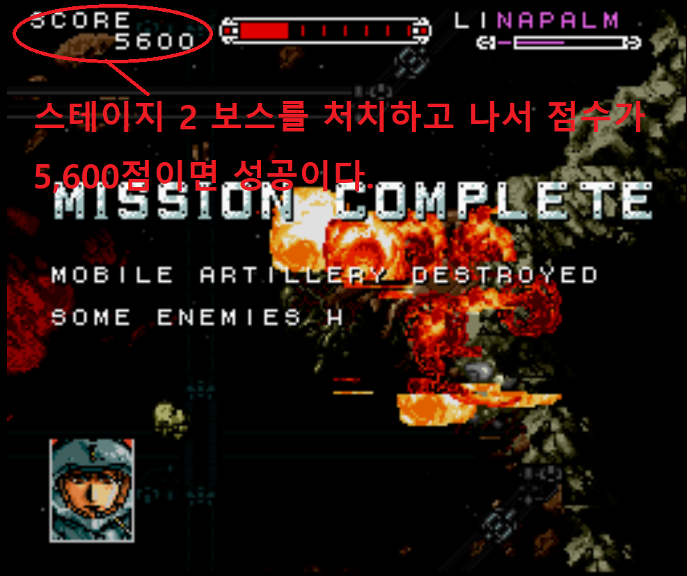 스테이지 1을 클리어했을 때, 보스만 처치하면 점수가 2,800점이 됩니다. 그리고 숨겨진 무기인 네이팜을 스테이지 2부터 사용할 수 있게 됩니다. 네이팜은 레벨 3까지 업그레이드가 가능한 무기이지만, 처음에는 레벨 1로 고정되어 있으며, 스테이지 2에서 일정 조건을 만족시키지 못한다면 아무리 파워 아이템을 획득해도 업그레이드를 할 수 없습니다. 참고로 네이팜은 레벨 1 이어도 매우 강력한 무기입니다.