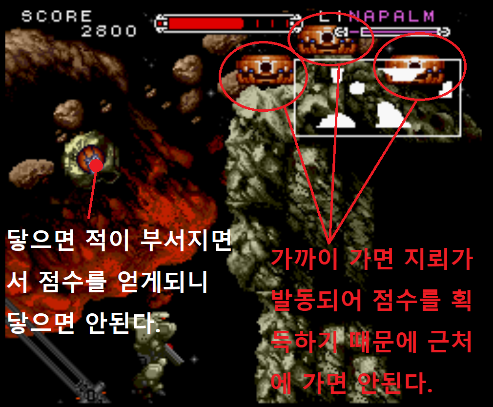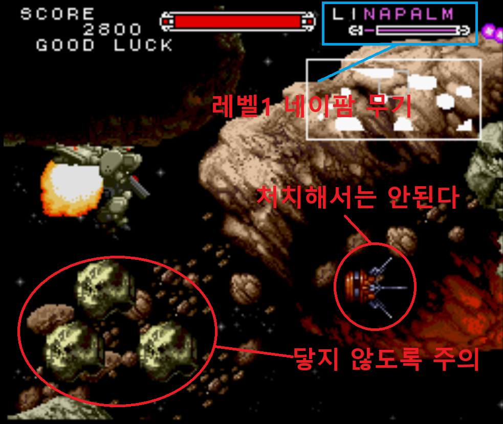 숨겨진 무기인 네이팜을 얻는 방법은 스테이지1에서 보스를 제외하고는 어떠한 오브젝트도 파괴해서는 안됩니다. 여기에 포함되는 오브젝트는 적뿐만 아니라 아이템을 보관하는 상자까지 포함됩니다.