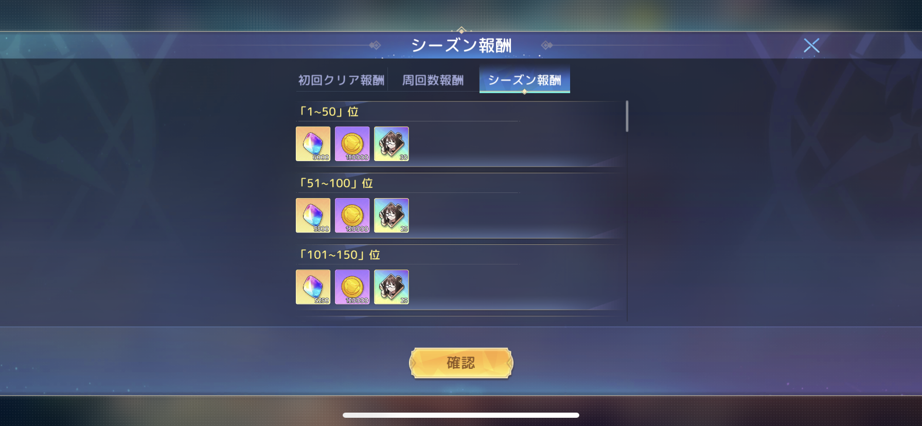 - 101등 ~ 150등: 다이아 5,250개, 12만 골드, 이루다 캐릭터 조각 25개