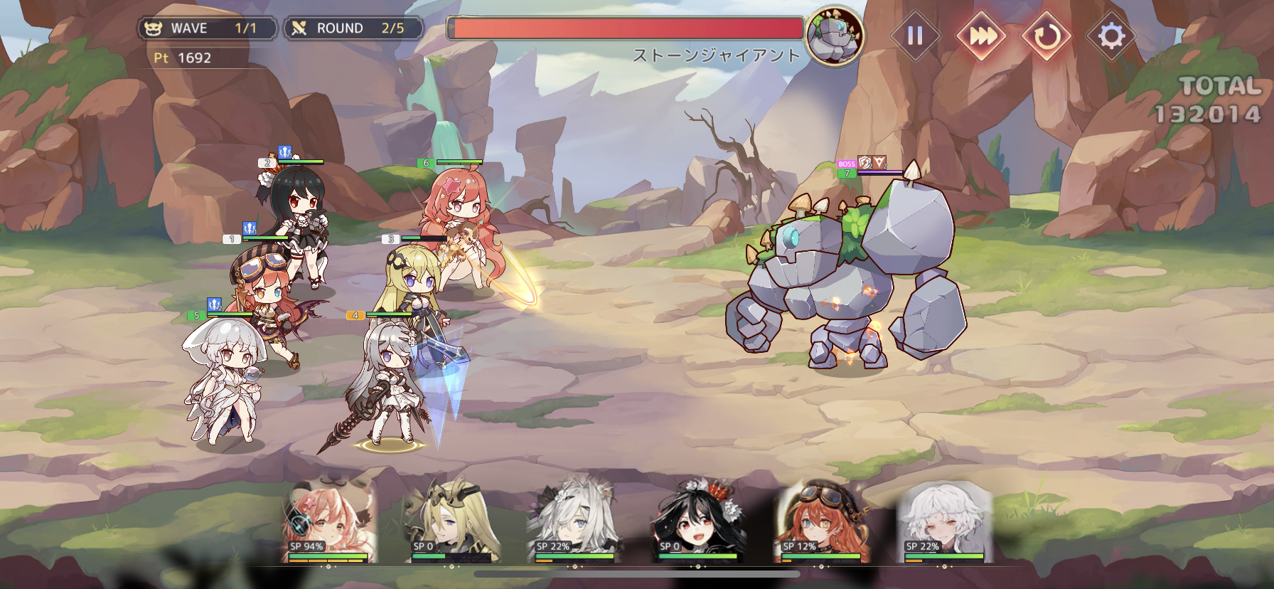 모의전 또는 실제로 해당 스테이지의 보스에게 도전을 하면 위와 같이 전투로 돌입하게 됩니다. 클랜배틀에서는 웨이브 밑에 점수가 표시되는데, 이 점수는 클랜배틀에 기여하는 점수로, 높으면 높을수록 자신이 속해있는 길드의 순위가 올라가기 때문에 좋습니다.