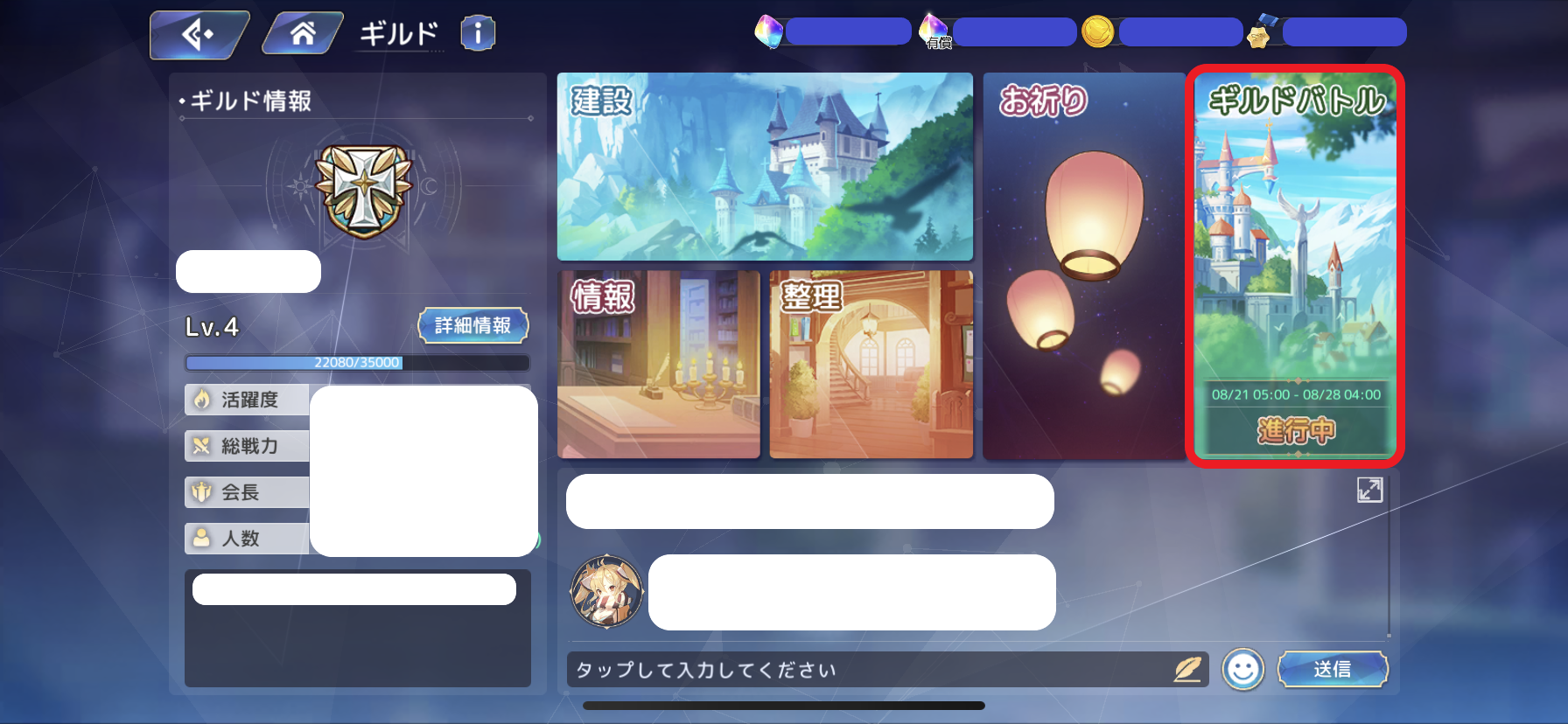 클랜 배틀에 참여하기 위해서는 우선 길드에 가입되어 있어야 합니다. 초반 스토리를 진행하다보면 길드를 창설할 수 있거나 가입할 수 있게 됩니다. 길드에 가입할 수 있으면 마음에 드는 길드에 가입하여 클랜배틀에 참여하도록 합시다.