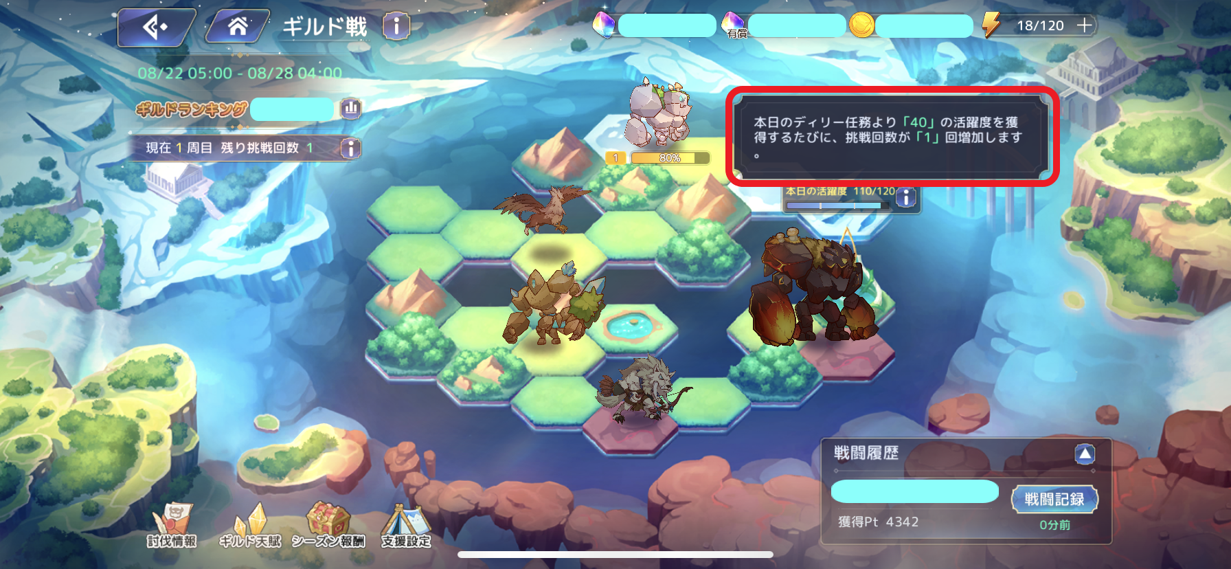 붉은색으로 동그라미 친 것들이 이번 클랜배틀 보스들입니다. 스테이지 1의 보스를 클리어해야 다음 스테이지의 보스에 도전이 가능하며, 이 화면에서 각종 보스의 로그와 시즌 보상 및 서포트 설정을 할 수 있습니다.