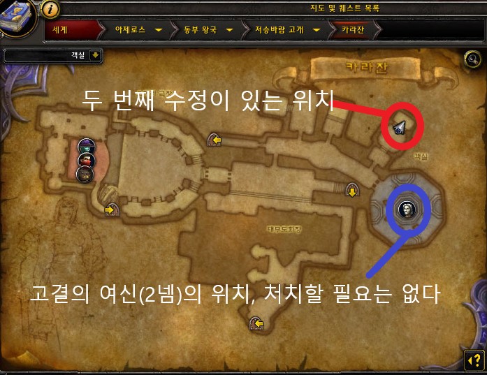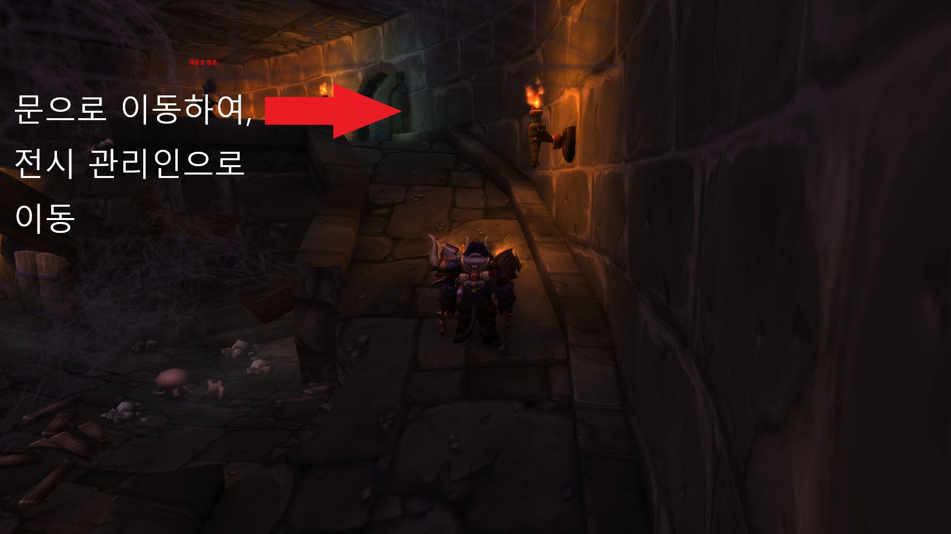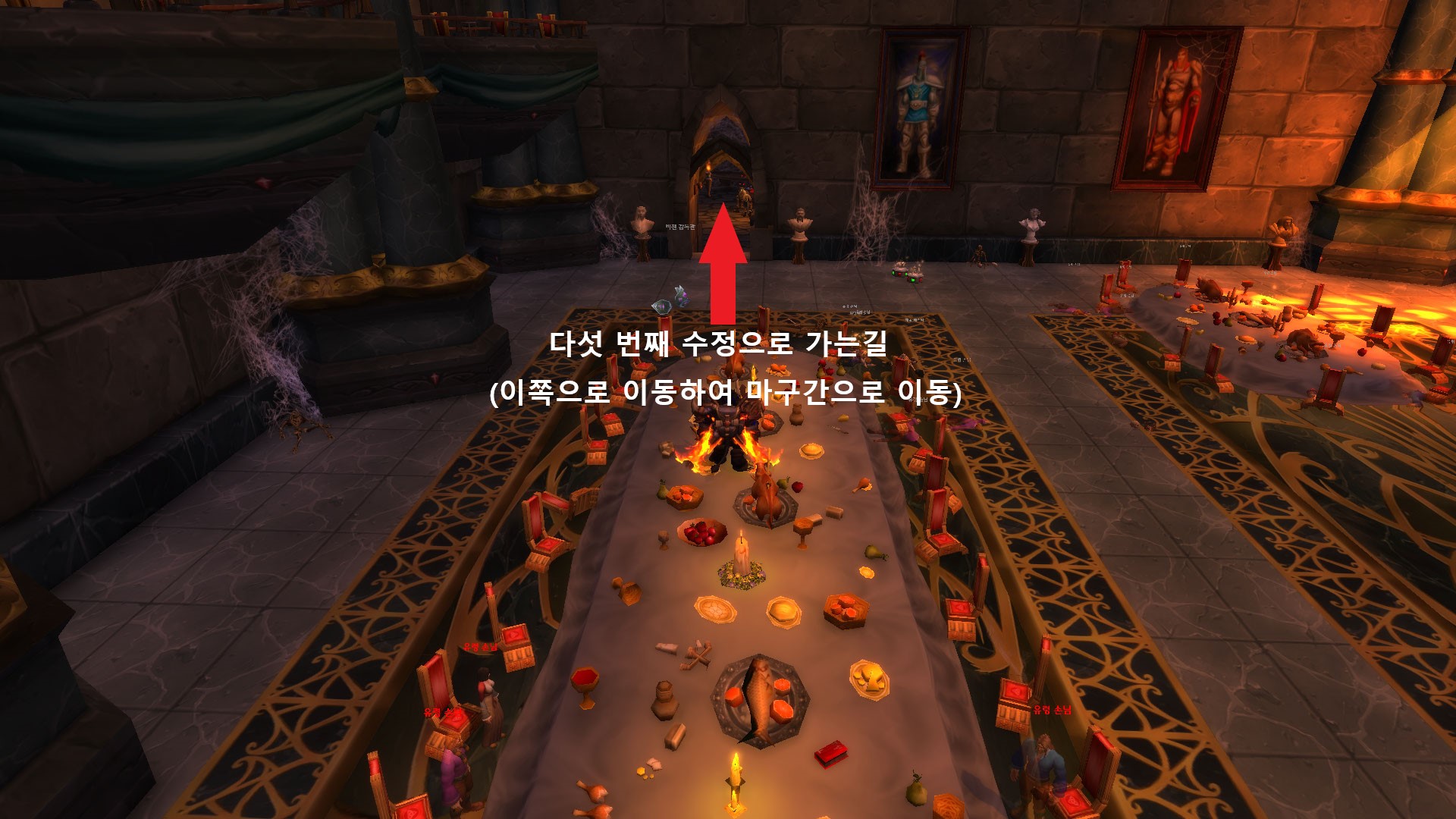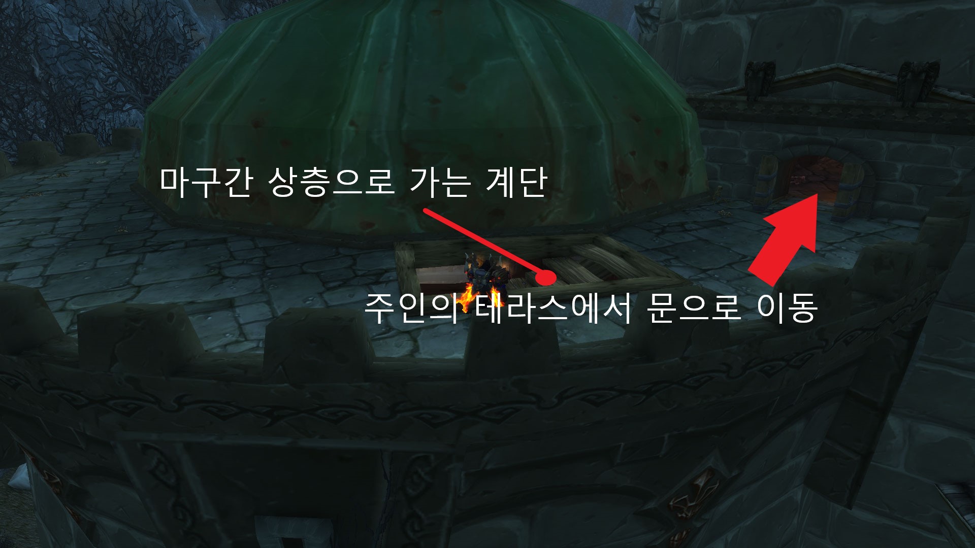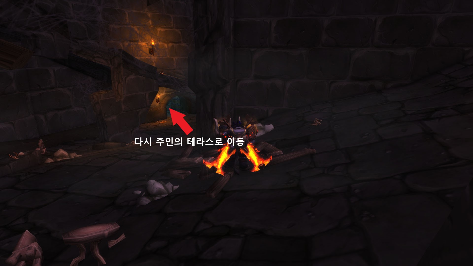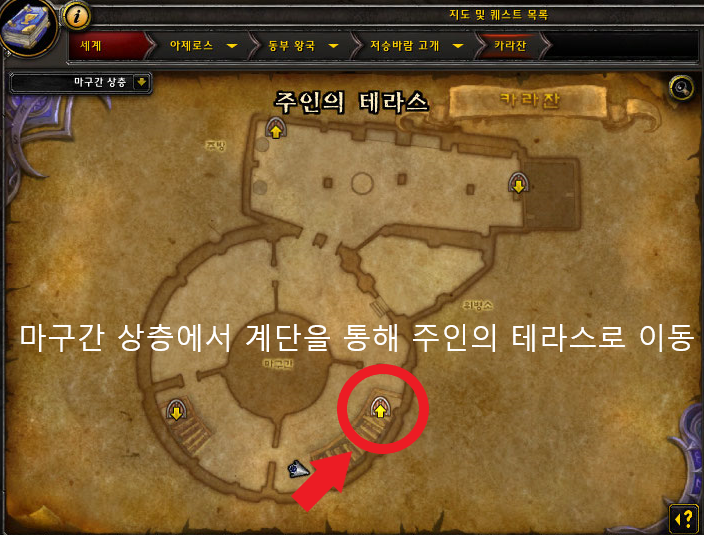전시 관리인 방으로 가기 위해 밴시가 있었던 문을 다시 통과하여, 다시 찾은 카라잔 던전 입구 쪽으로 이동하고 나면, 위의 스크린샷에 표시한 화살표 방향으로 이동하여 다시 주인의 테라스로 이동합니다.