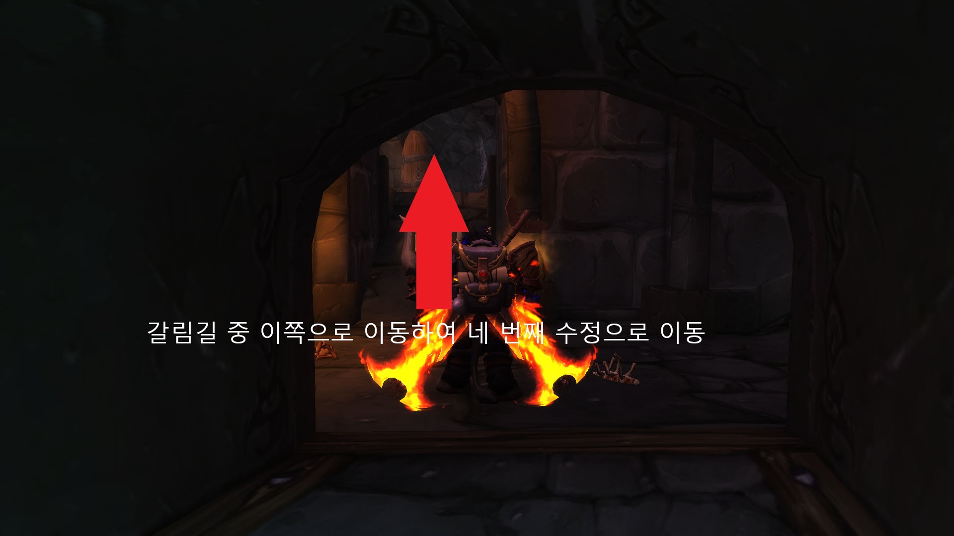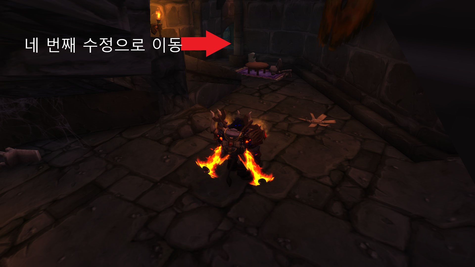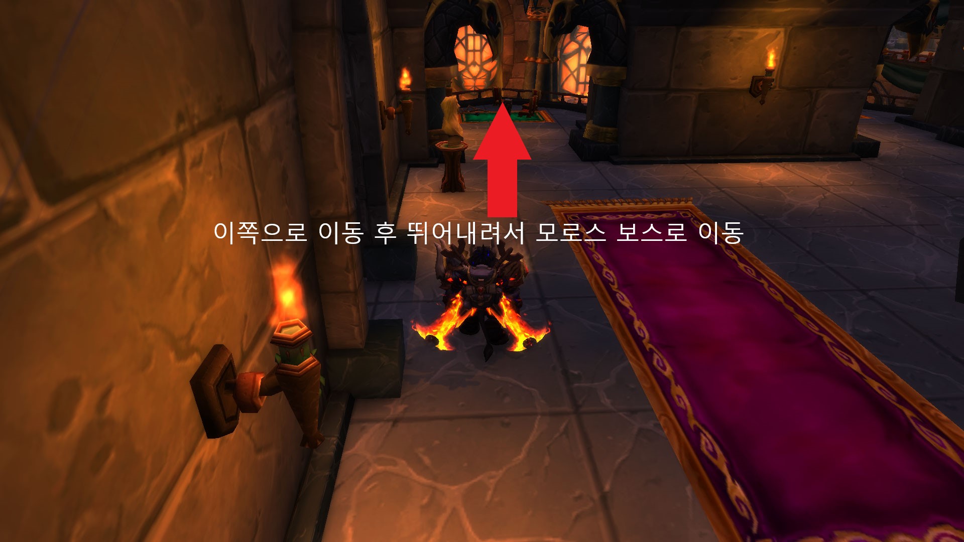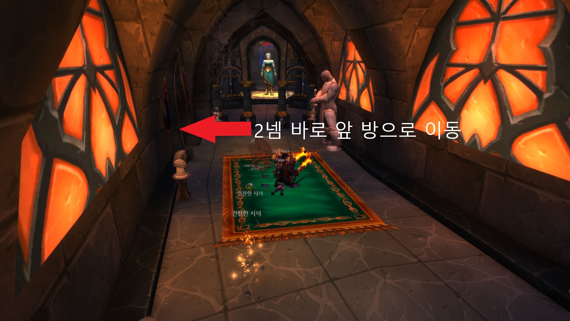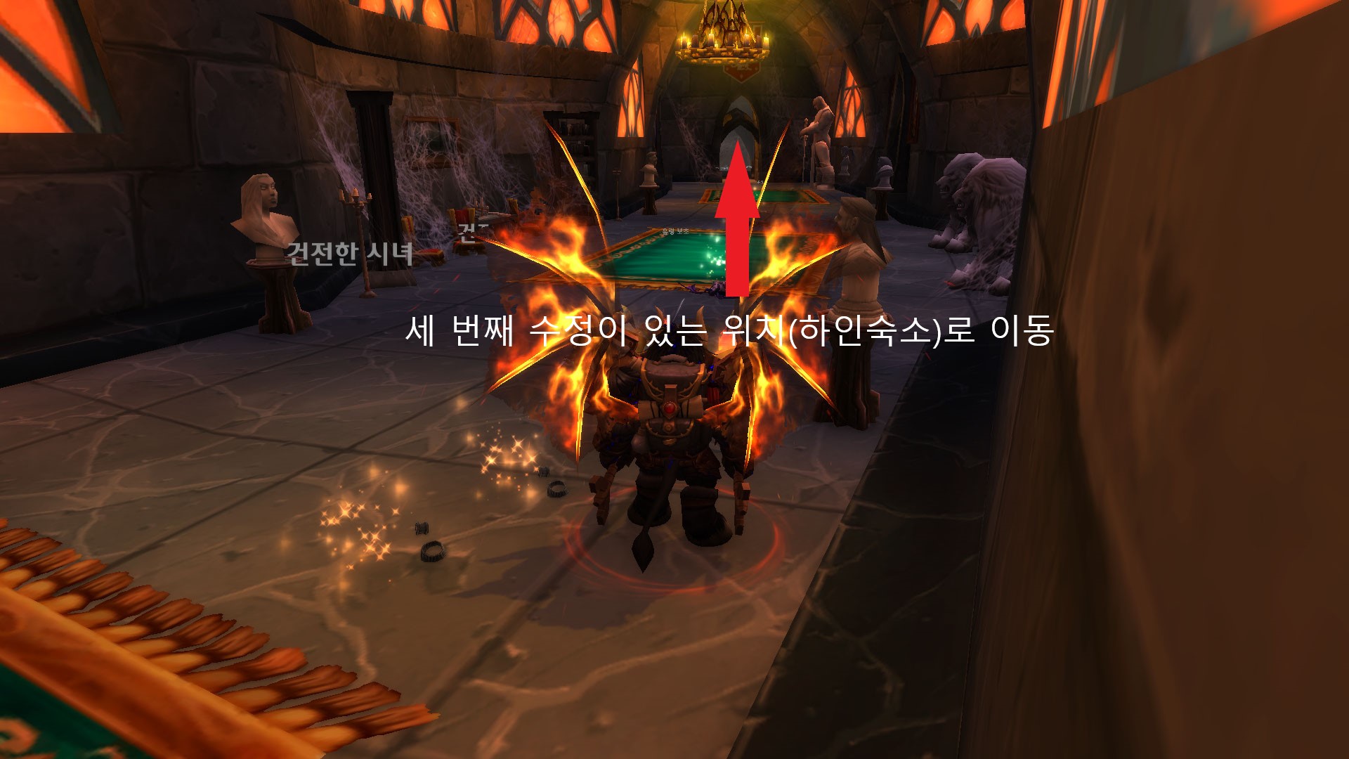 전시 관리인 방으로 가기 위해 밴시가 있었던 문을 다시 통과하여, 다시 찾은 카라잔 던전 입구 쪽으로 이동하고 나면, 위의 스크린샷에 표시한 화살표 방향으로 이동하여 다시 주인의 테라스로 이동합니다.