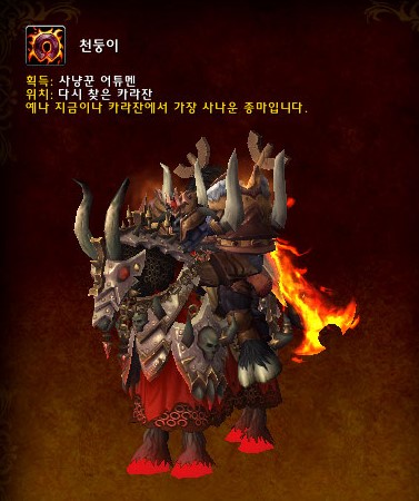 이글거리는 불꽃고룡 탈것 외형은 파멸의 어둠과 같으며, 천둥이 탈것은 사냥꾼 어튜멘이 타고 있던 천둥이와 같은 외형을 가지고 있습니다. 그리고 천둥이의 경우에는 불타는 성전의 천둥이에서 리뉴얼된 외형으로 상당히 멋진 모습을 가지고 있습니다.