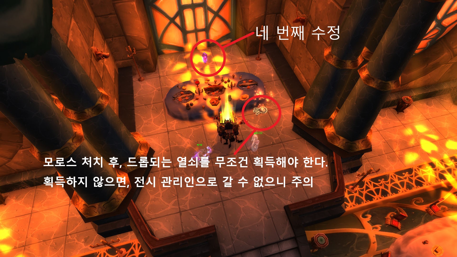 네 번째 수정 및 앞으로 진행하기 위해 모로스를 처치해야 합니다. 만약 본인의 아이템 스펙이 낮다면 모로스 보다는 주위에 있는 네임드급의 쫄들을 우선적으로 처치하시길 바라며, 위와 같이 모로스가 사용하는 범위 공격 스킬들을 피해 주시길 바랍니다. 아이템 스펙이 좋다면 스킬 몇 방으로 모로스를 빠르게 처치할 수 있습니다.