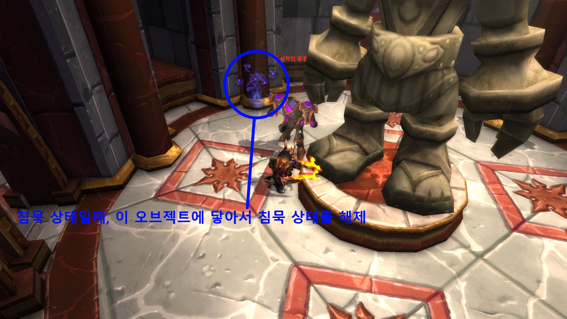 전시 관리인 방으로 진입하기 바로 전에 추상적인 종결자라는 쫄이 하나 있습니다. 이 쫄은 전투 개시 이후, 일정 시간이 지나면 침묵 스킬을 사용하는데, 침묵 상태일 때 아무런 공격을 할 수 없기 때문에 빠르게 침묵 상태에서 벗어나야 합니다. 추상적인 종결자가 침묵 스킬을 사용하면 위와 같이 오브젝트가 하나 생성되는데, 이 오브젝트에 닿으면 침묵 상태에서 벗어날 수 있으므로, 참고하시길 바랍니다.