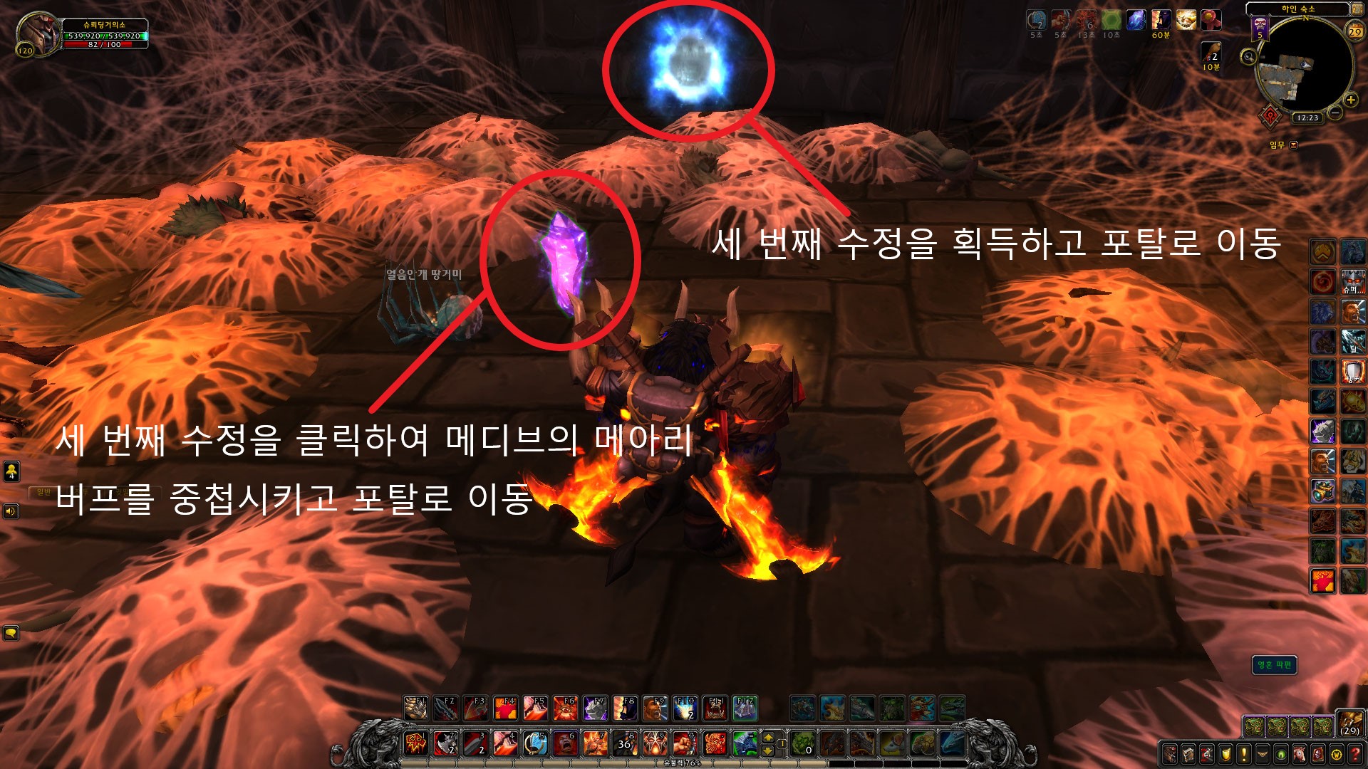 신화 난이도 다시 찾은 카라잔에 진입하고 나면 눈에 보이지는 않지만 제한시간이 흐르기 시작합니다. 그렇기 때문에 빠르게 첫 번째 수정을 획득하고, 메디브의 메아리 버프(버프 지속시간이 제한시간이 됩니다.)를 획득해야 합니다. 수정은 총 5개가 있으며, 수정을 획득할 때마다 메디브의 메아리 버프가 중첩되며, 지속시간이 증가합니다. 다섯 번째 수정을 획득하고 나면 메디브의 메아리 버프가 메디브의 현신으로 바뀌며, 제한시간이 5분으로 설정됩니다.