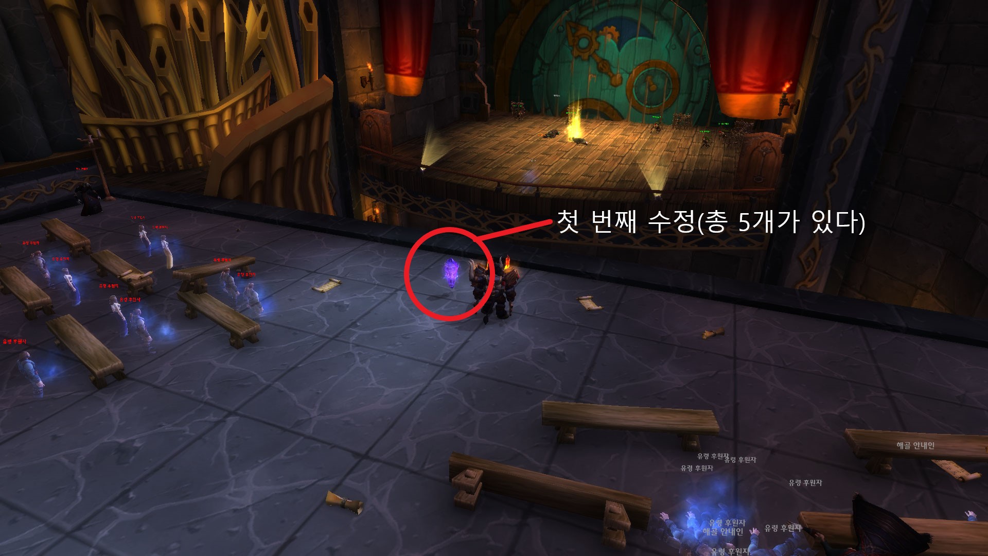 5개의 수정은 오페라 극장 관객석, 고결의 여신 앞에 있는 방, 거미가 있는 하인숙소, 모로스 네임드 뒤쪽, 전시 관리인(정확하게는 전시 관리인을 처치하면 수정이 드롭됩니다.)에 위치하고 있습니다. 수정의 획득 순서는 상관이 없으나, 시간 소모 없이 빠르게 이동해야 하기 때문에 오페라 극장 관객석에 있는 수정을 획득하시는 것을 추천드립니다.