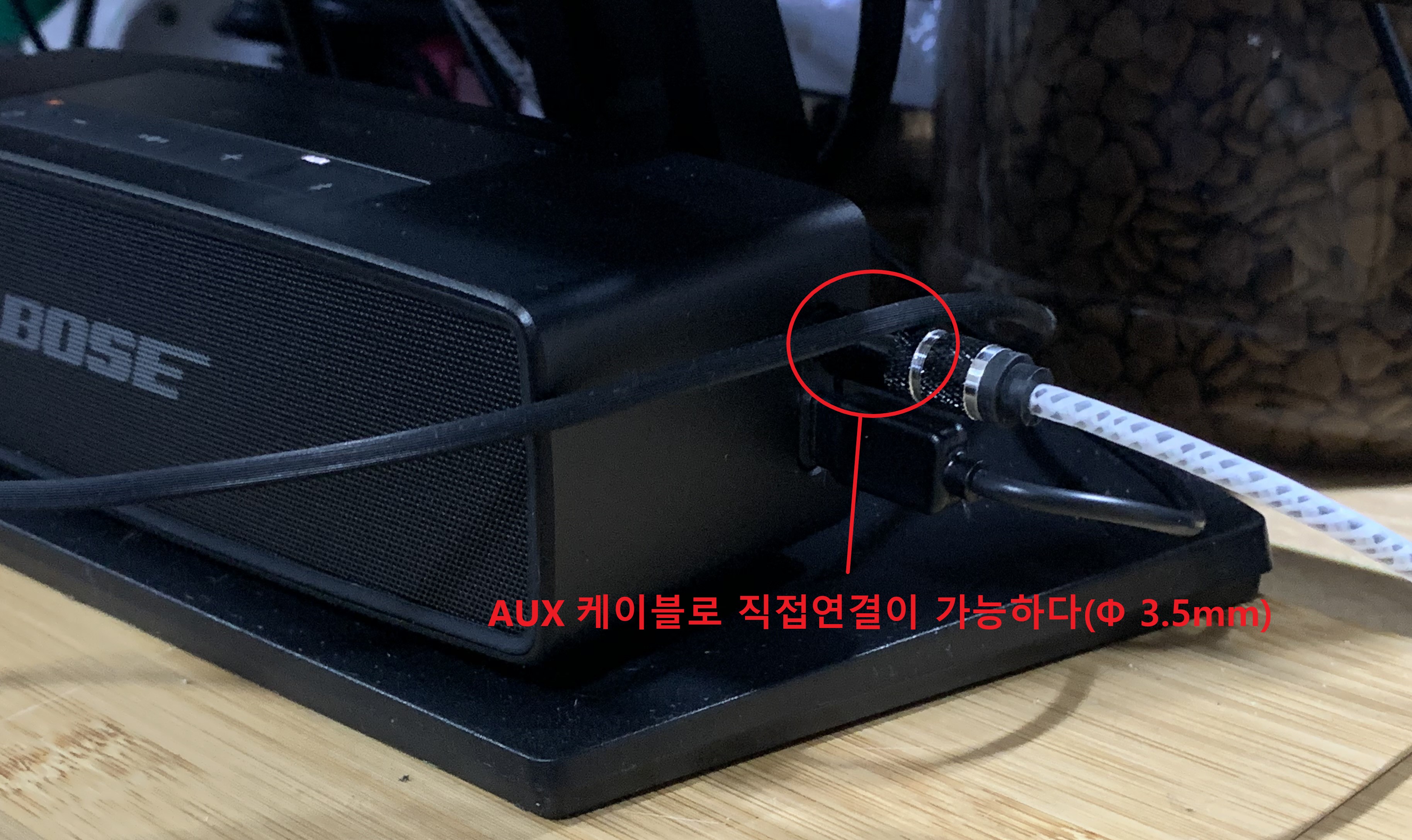 블루투스가 내장되어 있지 않은 PC에서 보스 사운드링크 미니 2 SE 제품을 사용하기 위해서는 위와 같이 AUX 케이블을 이용하여 직접 연결해야 합니다. AUX 케이블로 연결하면 블루투스 상태창 바로 옆에 AUX로 연결되었다고 알림 창에 표시가 됩니다. 그리고 예전 제품인 보스 사운드링크 미니 2에서도 AUX 단자를 지원하니 참고하시길 바랍니다.