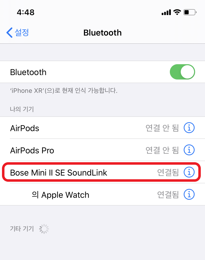 예를 들어 아이폰에서 블루투스 기기를 검색하면 위와 같이 보스 사운드링크 미니 2 SE 제품이 검색됩니다. 검색결과에서 보스 사운드링크 미니2 SE 제품을 터치하여 연결하면 블루투스 스피커에서 연결되었다고 음성으로 알려줍니다.