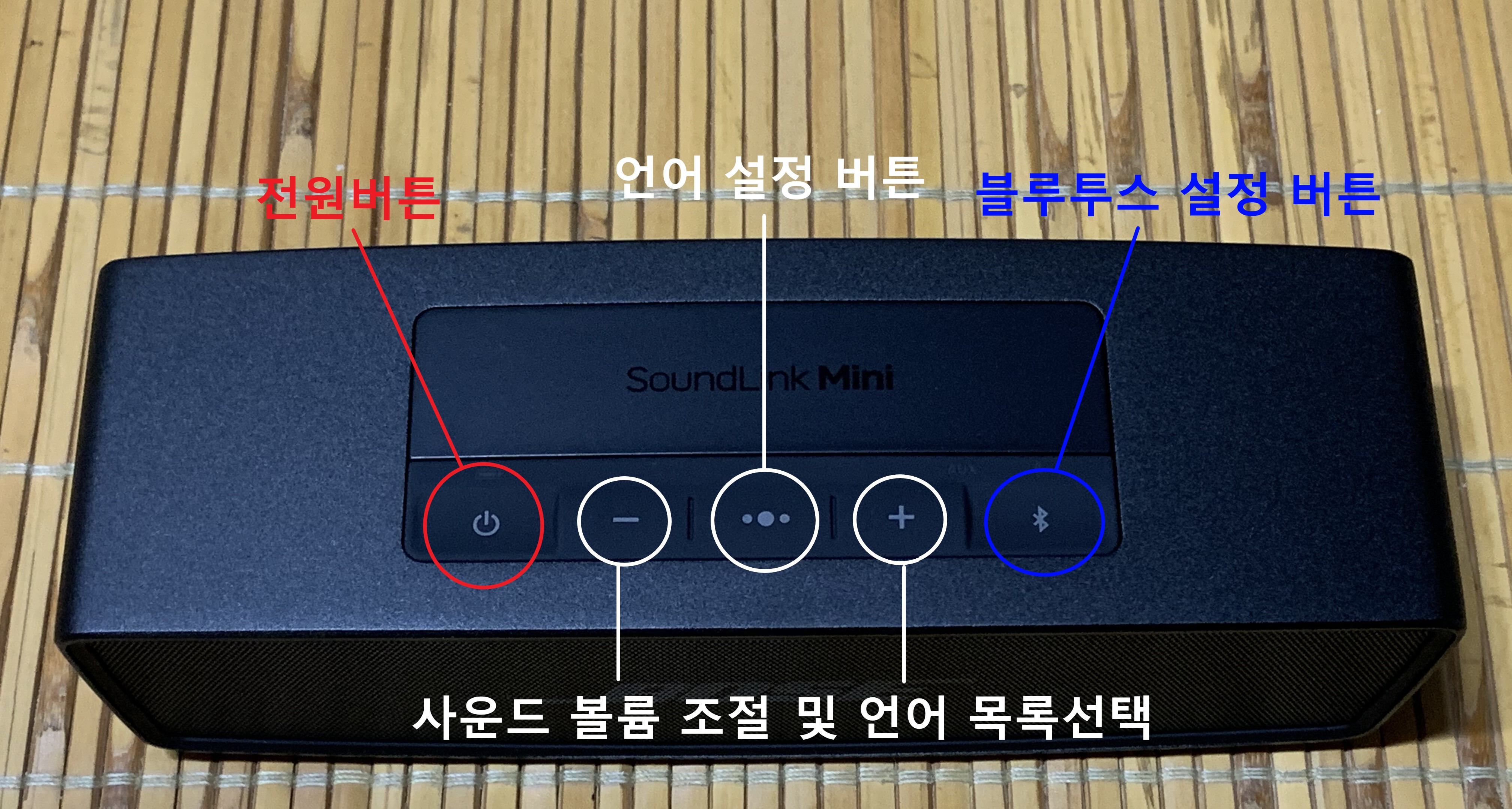 보스 사운드링크 미니 2 SE의 기기의 버튼은 총 5가지로 전원 버튼, 사운드 조절 버튼, 언어 설정 버튼, 블루투스 설정 버튼으로 구성되어 있습니다. 전원 버튼으로 기기의 ON/OFF가 가능하며, 언어 설정 버튼으로 기기의 언어를 설정할 수 있습니다. 보스 사운드링크 미니2 SE를 새로 구입하였다면 이미 배터리가 50% 정도 충전되어 있기 때문에 바로 기기를 켜실 수 있습니다. 기기를 켜시면 먼저 언어 설정 버튼을 통하여 언어를 설정해야 합니다.