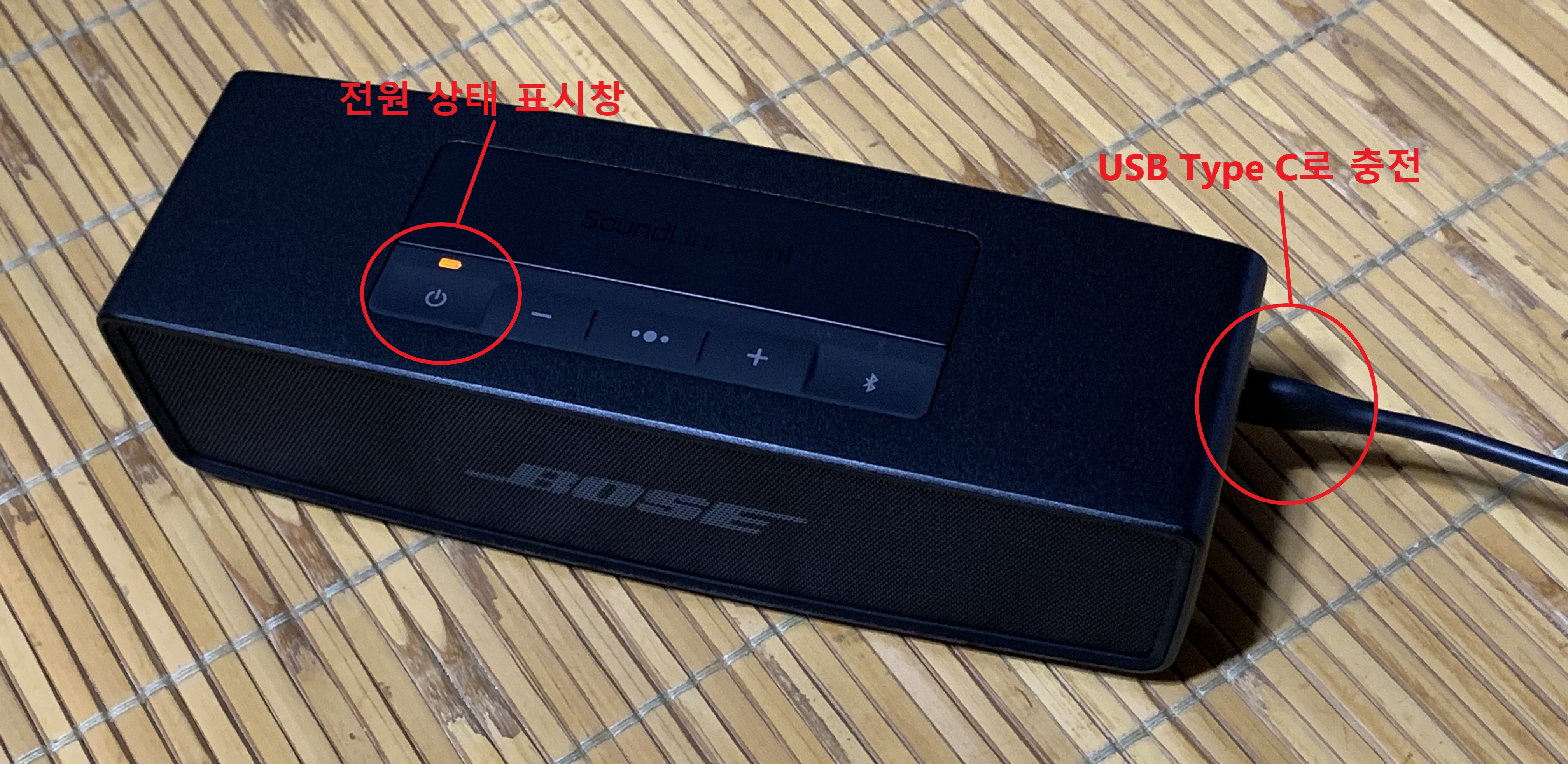 거치대나 충전기 어댑터가 따로 포함되어 있지 않아 저는 전격 용량을 지원하는 어댑터(5VDC 충전 어댑터)를 따로 구입하여 충전을 하였습니다.(정격출력 이외에 고속 충전기 또는 5V 이상 전압의 충전 장치를 통해 충전하면 제품에 문제가 발생될 수 있으며 이로인한 무상 수리 및 교환은 불가능하니 참고하시길 바랍니다.) 충전을 하기 시작하면 위와 같이 전원 상태 표시창에 색이 들어와 배터리 상태 및 충전 중임을 알 수 있습니다. 참고로 보스 사운드링크 미니 2 SE 제품을 켜면 설정된 언어로 현재 배터리가 몇퍼센트 남아있는지 알려줍니다.