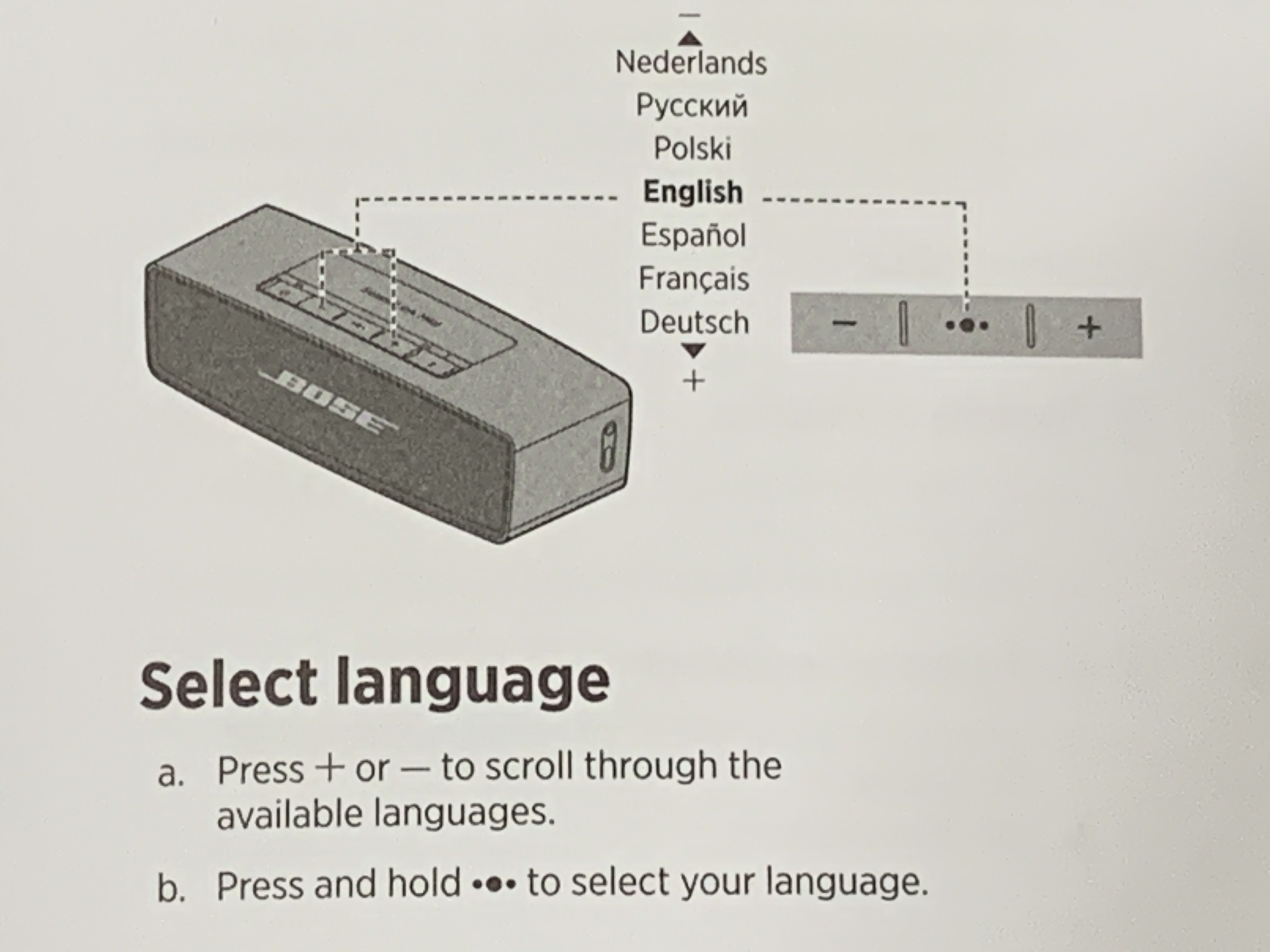 기기를 켜고 나서 언어 설정 버튼을 누르면 음성으로 현재 어떤 언어로 설정되어 있는지 확인이 가능합니다. 보스 사운드링크 미니 2 SE는 영어, 일본어, 독일어 등등 여러 언어를 지원하지만 안타깝게도 한국어는 지원하지 않습니다. 사운드 조절 버튼을 통해 본인에게 가장 친숙한 언어를 설정하고 마지막으로 다시 언어 설정 버튼을 눌러서 사용할 언어를 선택하면 언어 설정 단계는 마무리됩니다.