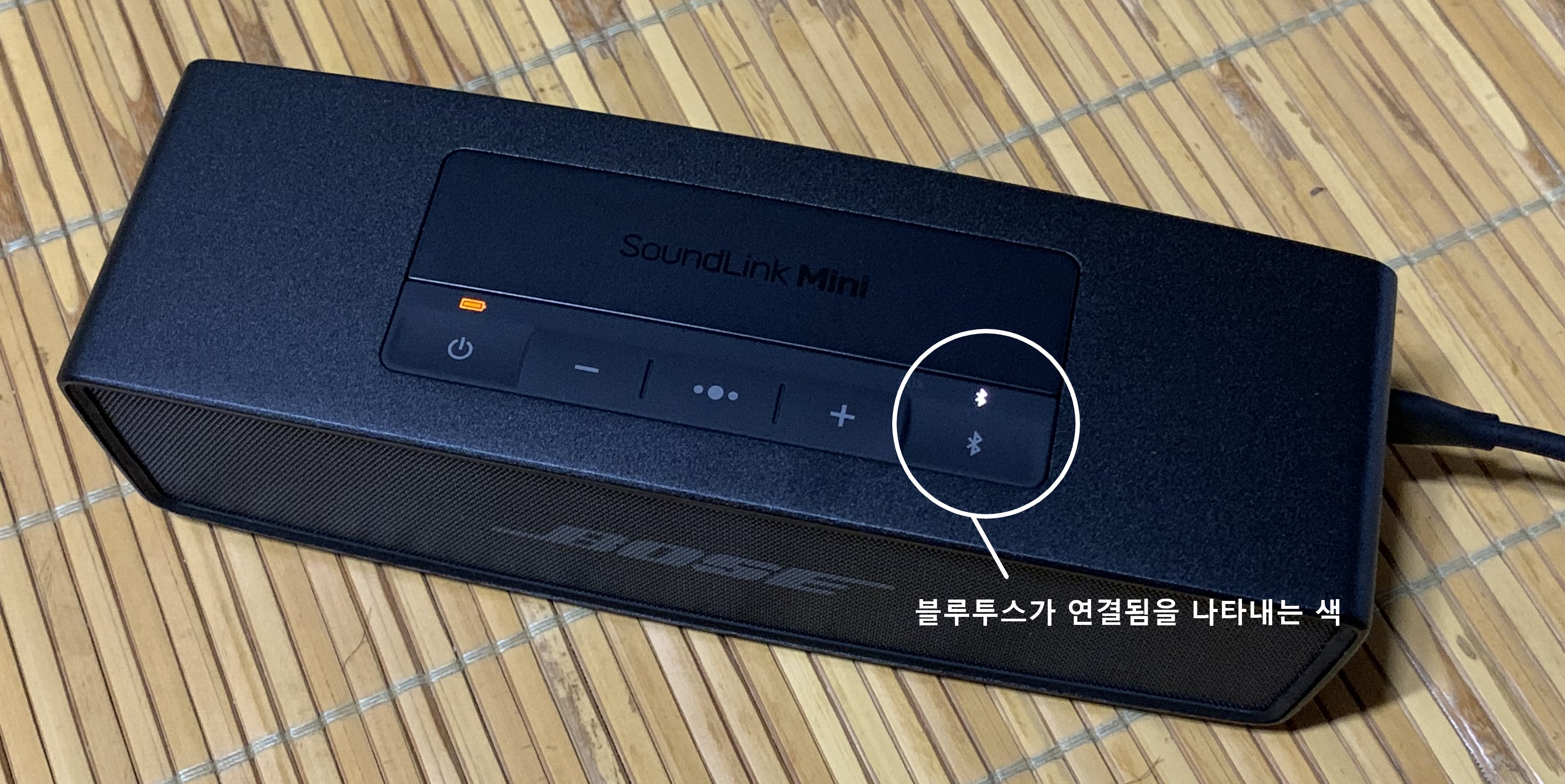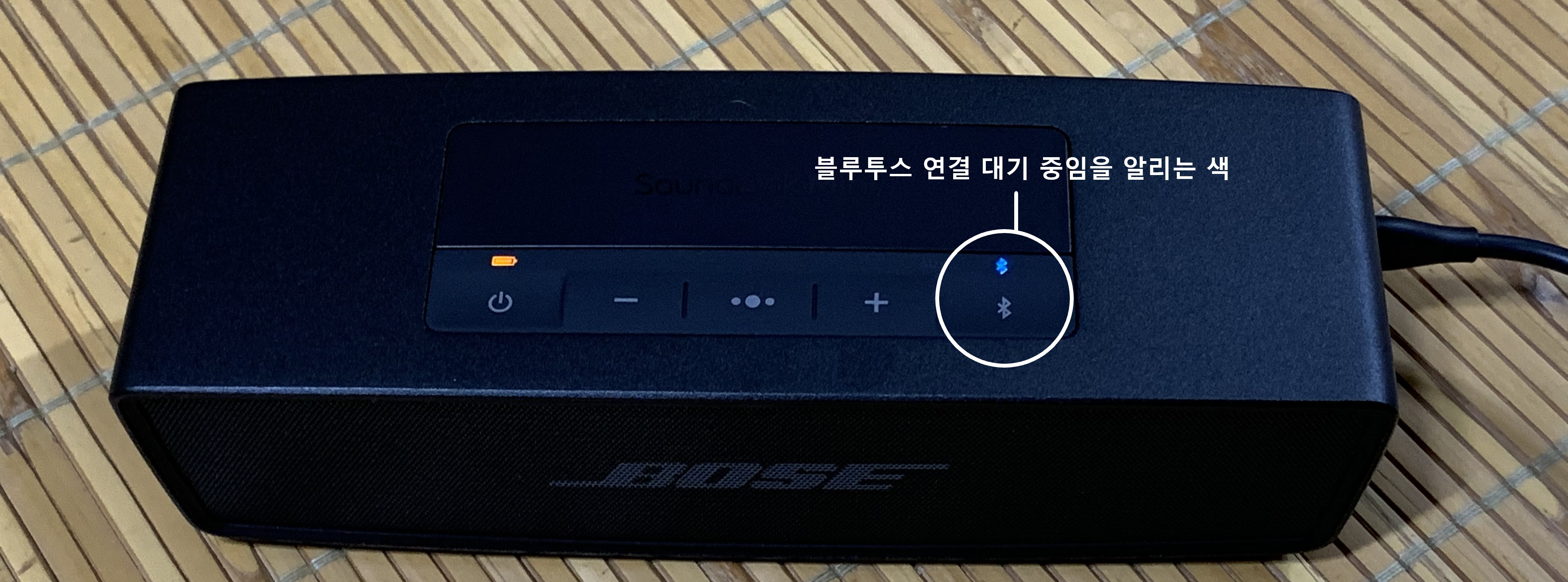 보스 사운드링크 미니 2 SE 제품은 블루투스에 연결되어 있지 않으면 위와 같이 블루투스 알림 창의 색이 파란색으로 나타납니다. 블루투스로 연결하려면 따로 설정할 필요 없이 연결하고자 하는 기기에서 블루투스 기기를 검색하여 연결하면 됩니다.