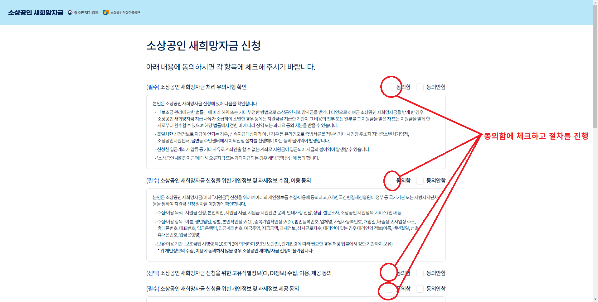 4. 확인 버튼을 클릭하면 위의 스크린샷과 같이 소상공인 새희망자금 신청 화면이 나오며 동의하는 칸이 나옵니다. 필수 부분은 동의를 해야 진행이 가능하므로 필수란에는 꼭 동의를 하셔야 합니다. 그리고 선택란에 동의하는 부분은 총 2개가 있는데 소상공인 새희망자금 신청을 위한 고유 식별정보 수집, 이용, 제공 동의는 선택임에도 불구하고 동의하기를 해야 진행이 가능합니다. 즉, 맨 마지막 부분을 제외하고는 다 동의를 해야 합니다. 글을 확인하고 동의란에 체크를 마치셨다면 맨 아래쪽에 있는 확인 버튼을 클릭하여 절차를 진행합니다.