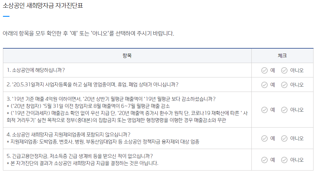 ● 소상공인 새희망자금 지원자격 자가진단표