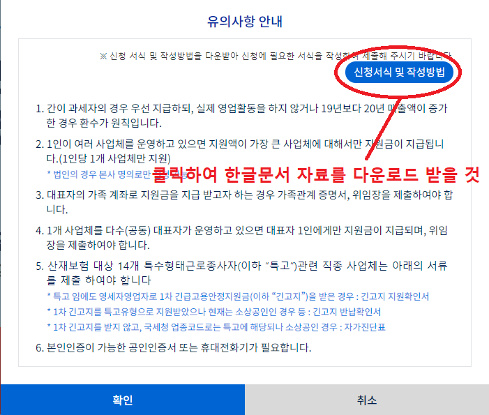 3. 신청하기를 클릭하면 위와같이 유의사항이 나오는데 스크린샷에 표시된 신청서식 및 작성방법을 다운로드하시고 유의사항 안내글을 꼭 읽어 보시길 바랍니다. 신청서식 및 작성방법을 다운로드하고 나서 유의사항 안내까지 확인하셨다면 밑의 확인 버튼을 클릭합니다.