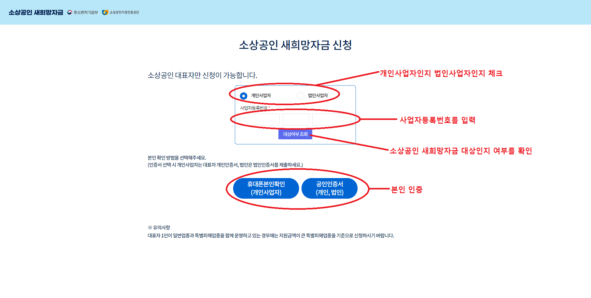 5. 소상공인 새희망자금 신청 동의가 끝났다면 위와 같이 소상공인 새희망자금 대상 여부 확인 화면이 나옵니다. 신청자(본인)의 사업체가 개인인지 법인인지 체크를 하시고, 사업자 등록번호를 기입하여 소상공인 새희망자금 대상 여부를 확인해야 합니다. 그리고 본인 인증을 해야 하는데, 개인사업자의 경우에는 휴대폰과 공인인증서를 통해 확인이 가능하며 법인일 경우에는 공인인증서로만 확인이 가능하니 참고하시길 바랍니다. 모든 확인 절차가 완료되면 화면에 나오는 대로 서류작성 및 제출을 하면서 절차대로 진행하셔서 소상공인 새희망자금 신청을 마무리하시면 됩니다.
