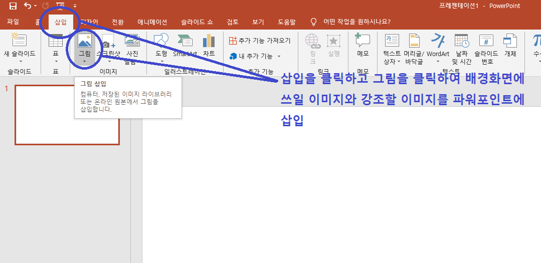 파워포인트의 메뉴 중 삽입을 클릭하고 그림을 클릭하면 이미지를 파워포인트에 삽입할 수 있습니다.