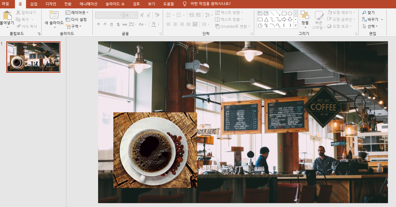 ● 파워포인트로 먼저 배경화면에 사용할 이미지를 삽입시키고 강조할 이미지를 적절한 크기로 삽입시킵니다.