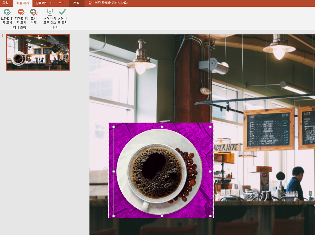 배경 제거를 클릭하면 위와 같이 표시할 영역을 지정하는 화면이 나옵니다. 영역을 잘 지정하여 강조할 이미지의 배경화면을 제거합니다.