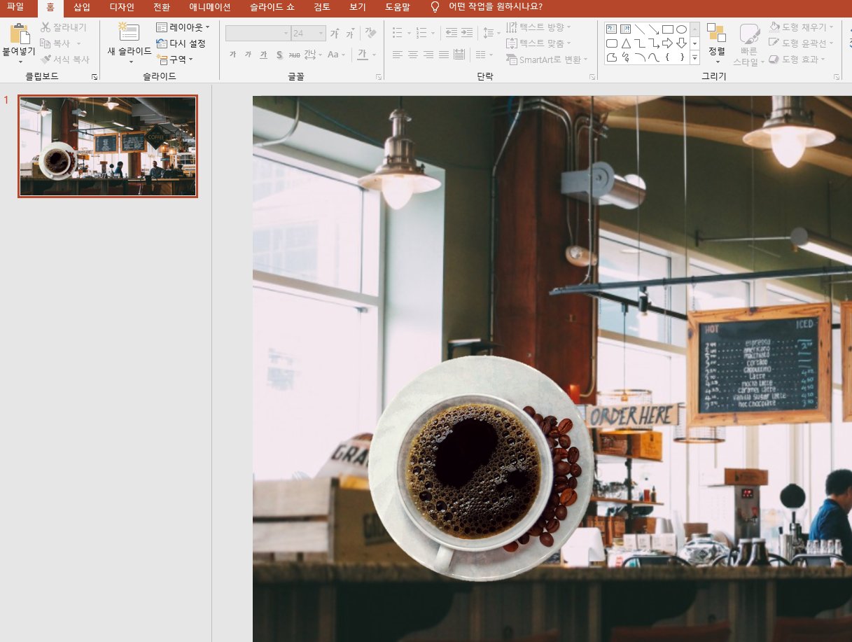 영상의 썸네일을 만들기 위해서는 배경화면이 될 이미지와 강조하는 이미지를 구해야 합니다. 배경화면이 될 이미지는 보통 영상 중에 마음에 드는 장면을 선택하는 편이며, 강조할 이미지는 영상 속 또는 다른 이미지를 활용하면 됩니다. 그리고 강조할 이미지를 배경화면에 삽입하고 문구를 이미지에 삽입시키면 썸네일이 완성되는데 강조할 이미지를 파워포인트의 배경 제거 기능을 이용하여 배경화면에 깔끔하게 삽입시키는 것이 주 포인트입니다. 계속하여 커피에 대한 영상을 유튜브로 올린다고 가정하고 썸네일을 만드는 과정에 대하여 알아보도록 하겠습니다.