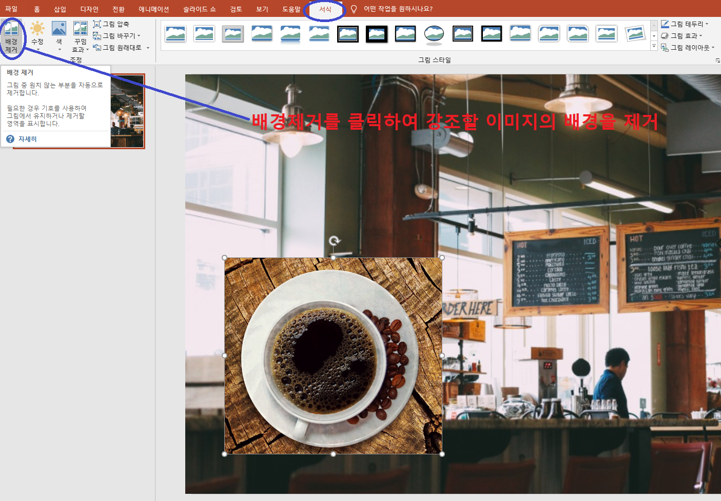 만약 강조할 이미지를 더블클릭했는데도 불구하고 배경 제거가 보이지 않는다면 그림 도구 -> 서식 -> 배경 제거의 기능을 이용하면 됩니다.