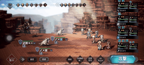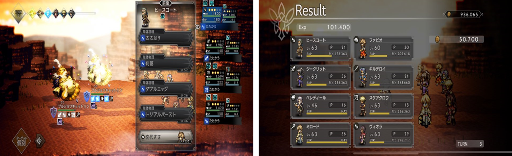 옥토패스 트래블러 대륙의 패자는 맵을 이동 하다 보면 랜덤으로 적과의 조우가 발생되어 전투로 돌입하게 됩니다. 오토로 전투를 진행할 수 없어 캐릭터마다 행동 설정을 하여 전투를 진행해야 합니다. 전투 방식은 파이널 판타지, 어나더 에덴 등과 같이 턴제 RPG 방식을 따르고 있습니다.