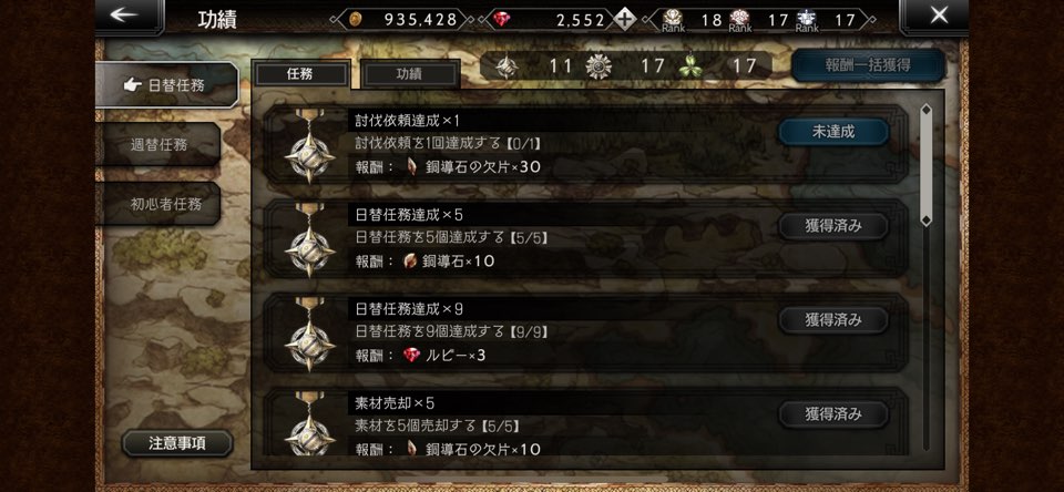 공적(업적)에서는 해당 조건을 달성하면 보상을 얻을 수 있습니다. 캐릭터 뽑기에 필요한 재화인 루비를 획득할 수 있으며, 영향력의 레벨에 영향을 주는 경험치도 획득할 수 있습니다. 공적(업적)에는 일일 퀘스트도 포함되어 있는데 일일 퀘스트를 모두 달성하면 루비 3개를 획득할 수 있으니 시간이 된다면 일일 퀘스트를 진행하여 캐릭터 뽑기에 사용되는 루비를 획득해봅시다.(참고로 로그인을 통해 매일 루비 10개를 얻을 수 있습니다.)
