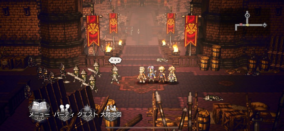 옥토패스 트래블러 대륙의 패자의 인터페이스는 어나더에덴과 같이 최대한 게임에 집중할 수 있도록 간단하게 구성되어 있습니다. 우측 상단에 맵이 표시되어 있으며 좌측 아래쪽에 메뉴, 파티 구성, 퀘스트, 맵이 표시되어 있습니다.