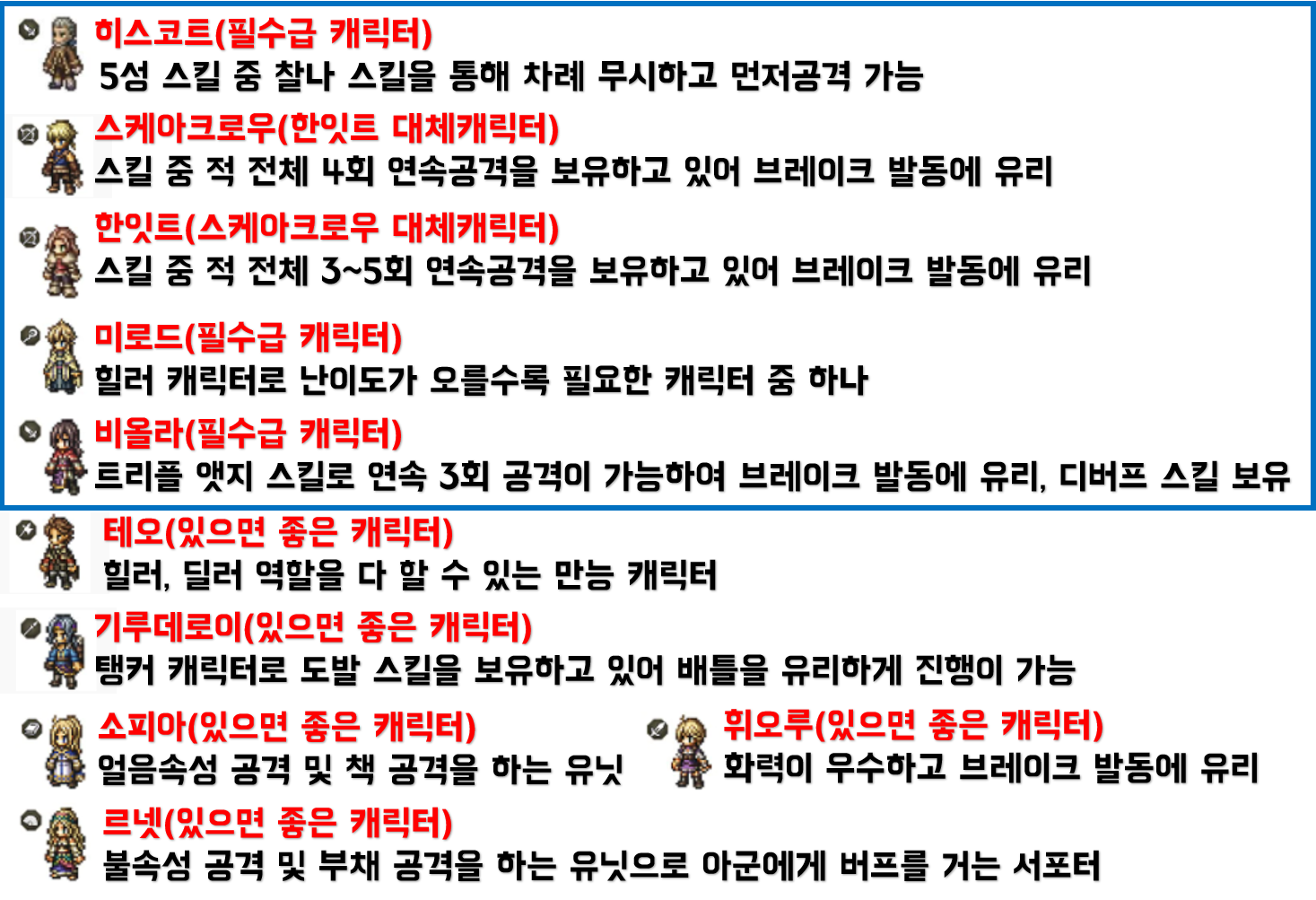 위의 캐릭터 추천도는 개인적으로 게임을 진행해보고 좋다고 생각하는 5성 캐릭터들의 추천도입니다.(참고로 이 게임에서는 5성 캐릭터들이 제각각 좋은 성능과 특징을 가지고 있습니다.) 추천하는 캐릭터들 중 히스코트를 넣은 이유는 레벨업 작업에서 유용하게 사용할 수 있기 때문인데 찰나 스킬을 사용하여 캣이 도망가기 전에 먼저 공격하여 브레이크를 걸 수 있기 때문입니다. 현재로써는 히스코트를 대체할 캐릭터가 없기 때문에 히스코트 픽업 가챠를 하여 히스코트를 뽑고 그 외 5성 캐릭터를 몇 개 더 뽑는 것을 추천드립니다. 개인적으로는 히스코트, 스케아크로우 또는 한잇트, 미로드, 비올라 캐릭터를 추천합니다.