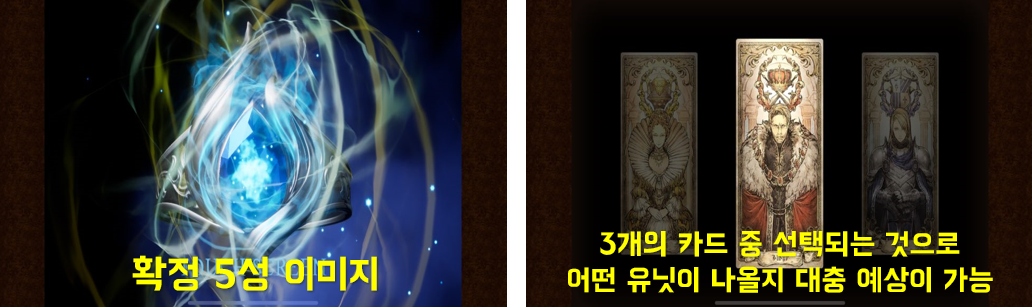5성이 확정으로 나오게 된다면 위와 같이 반지 주변에 노란색 빛이 나오게 됩니다. 그리고 카드 3개가 나오는데 3개의 카드 중 선택되는 카드를 보고 대충 어떤 유닛이 나올지 예상할 수 있습니다.