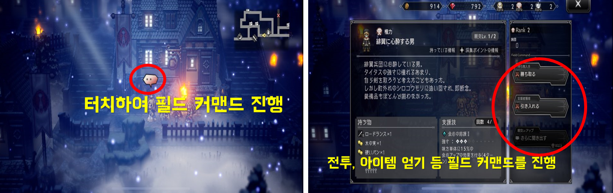 필드 커맨드는 NPC를 통해 진행할 수 있는 콘텐츠입니다. 자신의 명성에 따라 아이템을 얻을 수 있기도 하며, 전투를 통해 아이템을 얻을 수도 있습니다. 참고로 일일 퀘스트에 필드 커맨드가 포함되어 있으니 가능하다면 필드 커맨드를 진행하여 일일 퀘스트를 달성하도록 합시다.