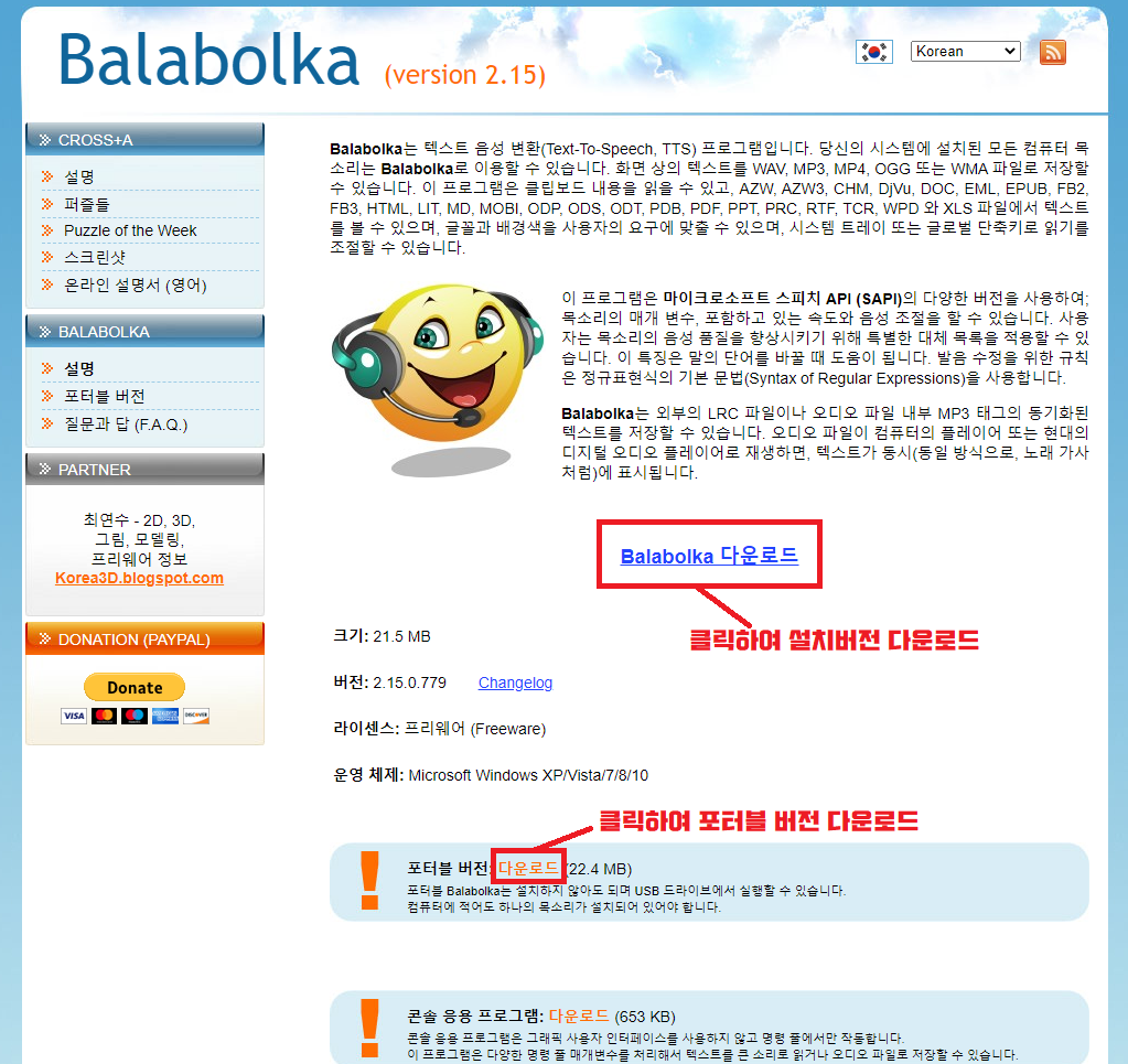위에 링크된 Balabolka 홈페이지에 접속하면 아래와 같은 화면이 나옵니다.