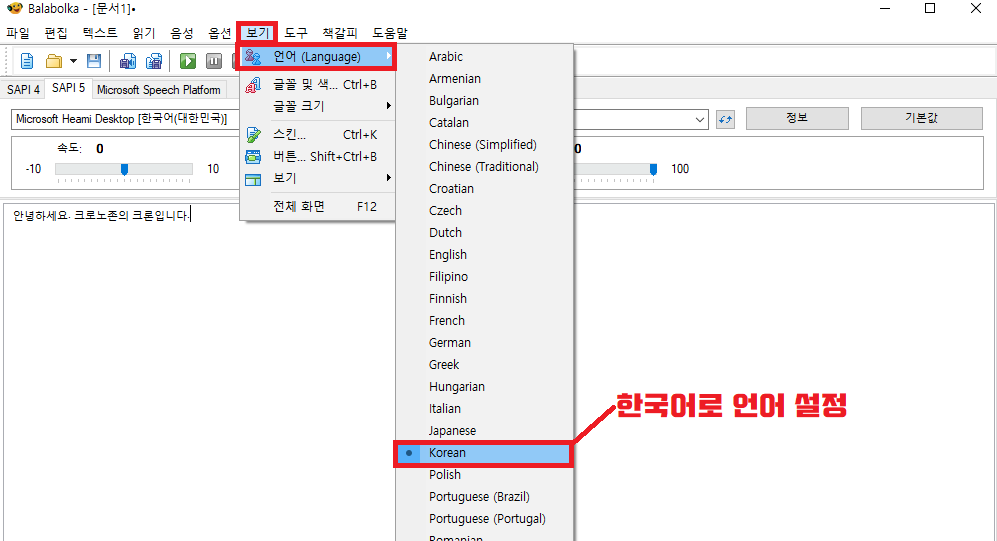 ※만약 Balabolka를 설치 후, 언어가 영어로 설정되어 있으면 보기-> 언어-> 한국어(Korean)로 설정하면 됩니다.
