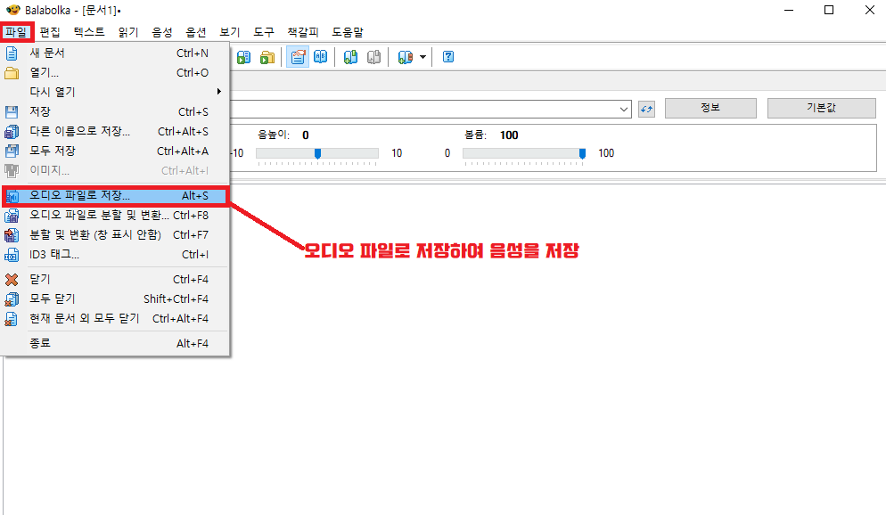 오디오 파일로 저장할려면 파일-> 오디오 파일로 저장을 클릭하고 저장할 이름 및 위치, 확장자명을 선택하고 저장하시면 됩니다.