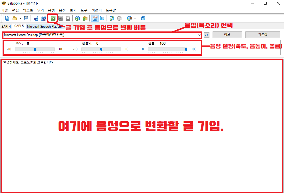 실행화면에서 음성(목소리)를 선택하고 음성 설정을 마친 후, 음성으로 변환할 글을 본문에 기입 후 마지막으로 음성으로 변환하는 버튼을 클릭하면 본문에 기입한 글이 설정한 목소리로 읽힙니다. 읽히는 음성 및 속도, 음높이, 볼륨이 마음에 들지 않았다면 다시 설정하시고 만약 마음에 드신다면 오디오 파일로 저장하여 사용하시면 됩니다.