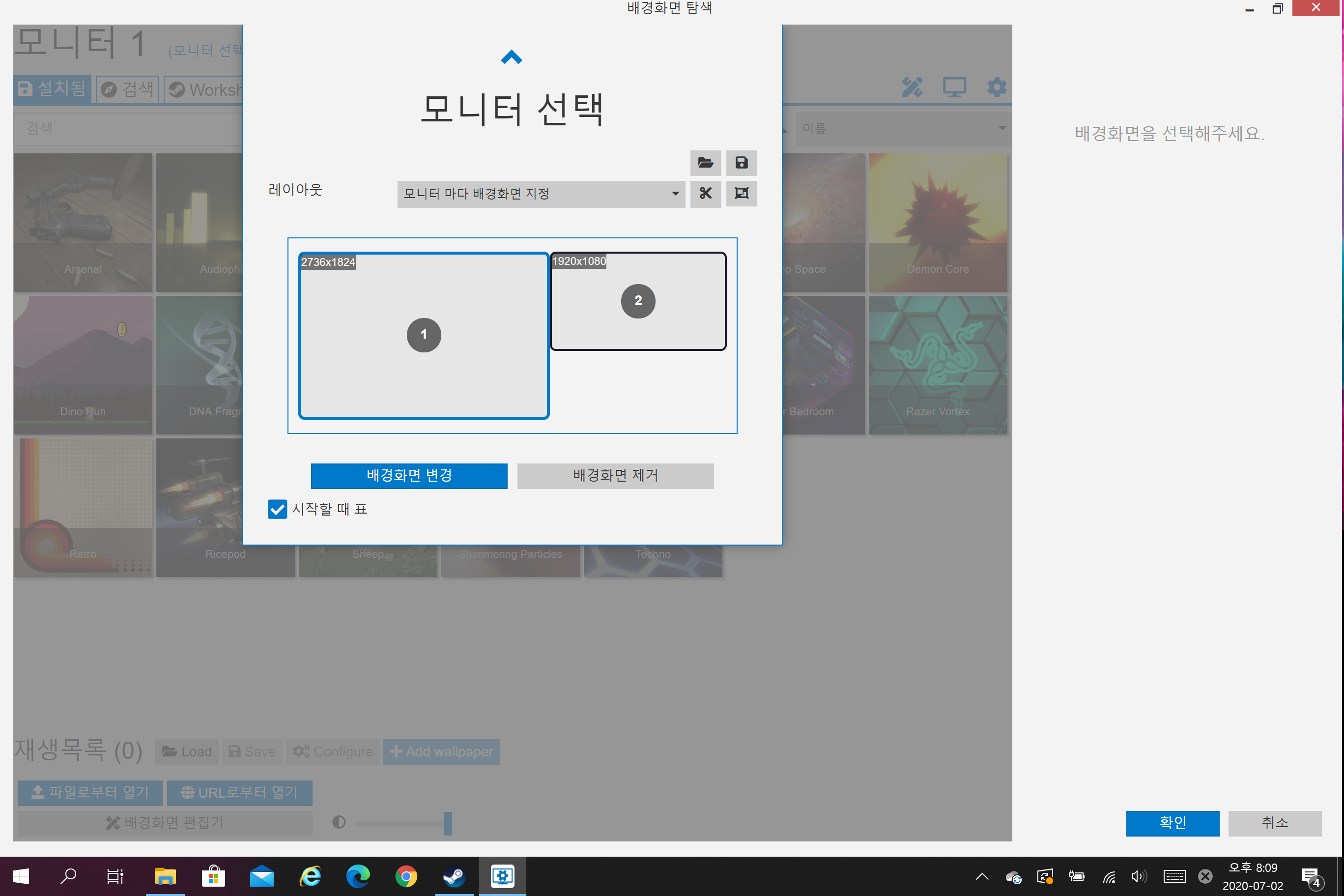 바탕화면을 변경할 모니터를 선택하라고 하는데, 자신이 바탕화면을 변경하고자 하는 모니터를 선택하고 난 뒤, 바탕화면을 변경하면 된다. 위 화면에서 변경했던 바탕화면을 제거할 수 도 있으니 참고할 것.