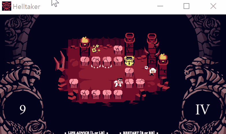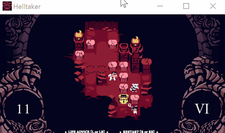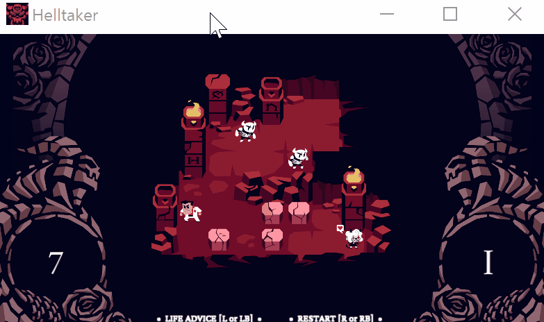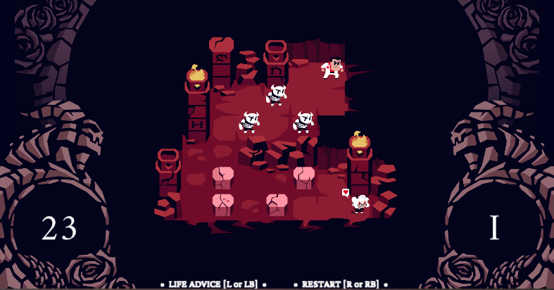 위의 스크린샷을 보면 좌측 아래쪽에 23이라고 적혀있는데 이는 행동횟수를 의미하며, 이 횟수내로 행동을 끝마쳐 클리어 조건을 만족시켜야한다. 스테이지 클리어 조건은 하트표가 있는 캐릭터(악마, 천사) 바로 옆으로 이동하는 것과 옳은 선택지를 선택하는것이다. 그리고 화면 우측 아래쪽에 로마숫자로 1이라고 적혀있는데 이는 스테이지1이라는 의미이다. 이게임은 특이하게도 스테이지 스킵기능을 이용하여 스테이지를 넘길 수 있는데, 퍼즐이 어려워 스테이지를 도저히 클리어하지 못할때 사용하면 된다. 대부분의 퍼즐이 어렵지 않으니 스킵 기능을 사용하는것을 추천하지는 않는다. 언어는 기본 영어로 되어있는데 영어에 익숙하지 않다면 한글패치를 통하여 한글로도 게임을 즐길 수 있으니 참고할 것.