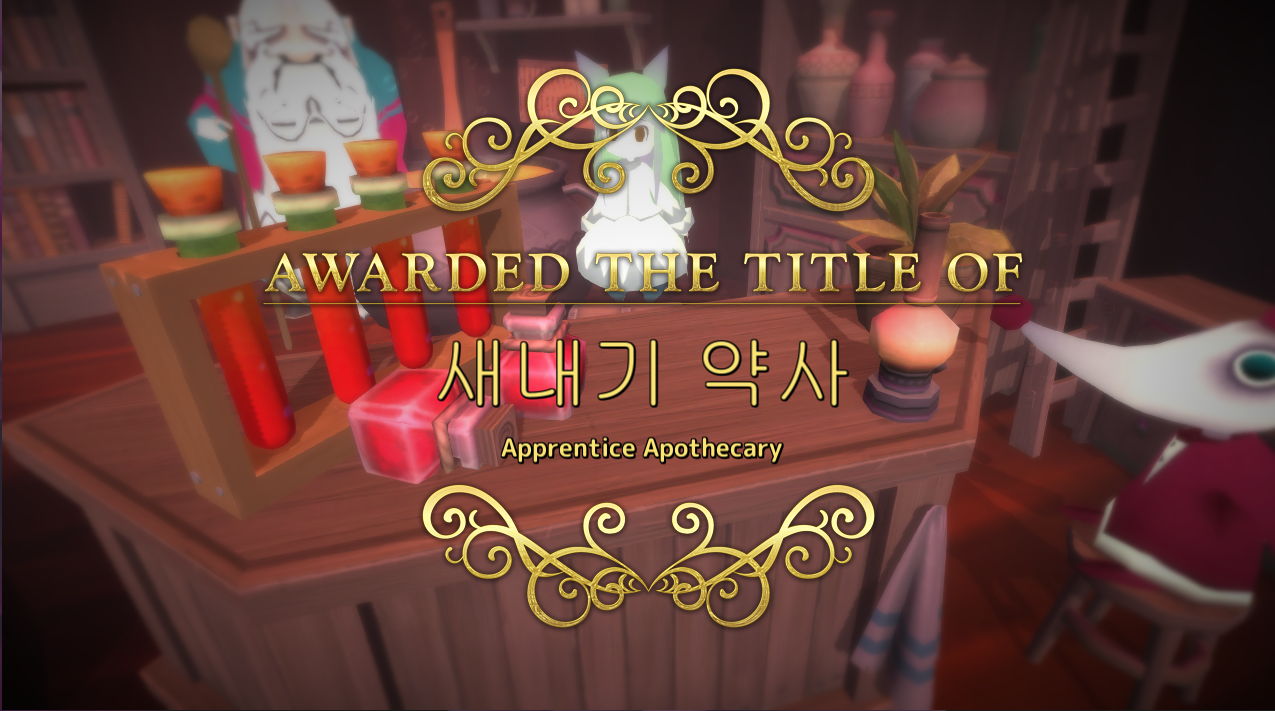 게임을 시작하면 힌트로 어떤 아이템이 필요한지 알려주는데 조건에 맞는 아이템을 모으고 비약을 만들면 위와같이 칭호를 얻고 다음단계로 진행된다. 단계가 진행되면 될수록 갈 수 있는 지역이 넓어지고 얻을 수 있는 아이템 또한 많아진다. 2단계까지는 수집하는 아이템에 조건이 붙지 않기때문에 금방 클리어가 된다. 3단계 부터는 조건에 맞는 아이템들만 수집하고 가야하기 때문에 게임의 난이도가 올라간다.